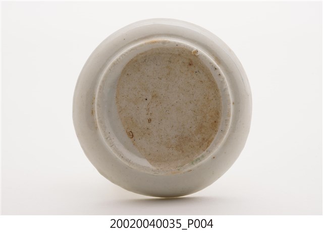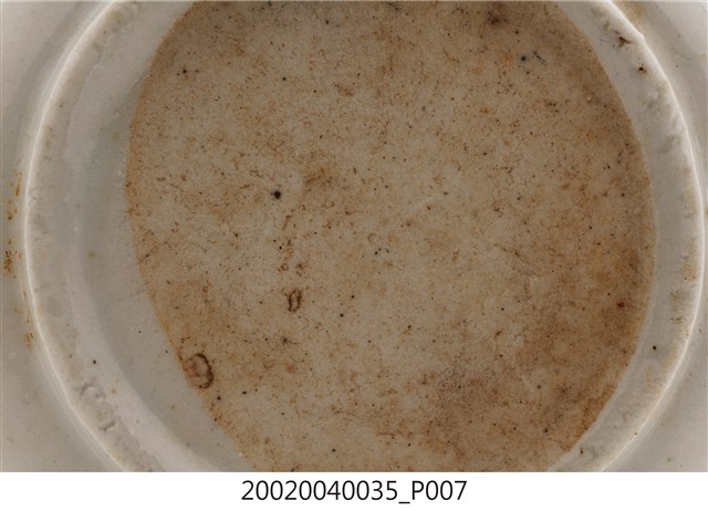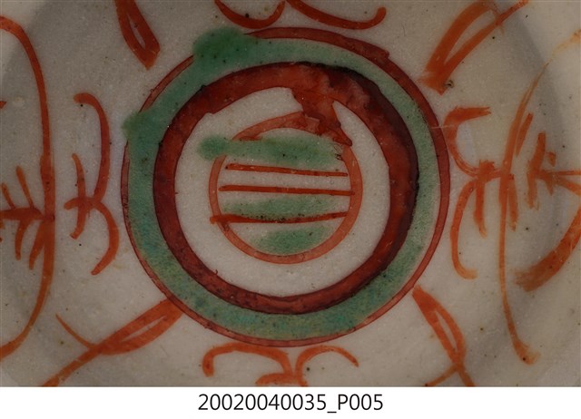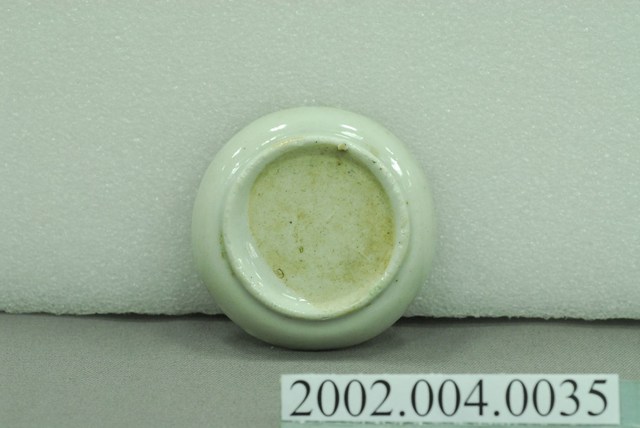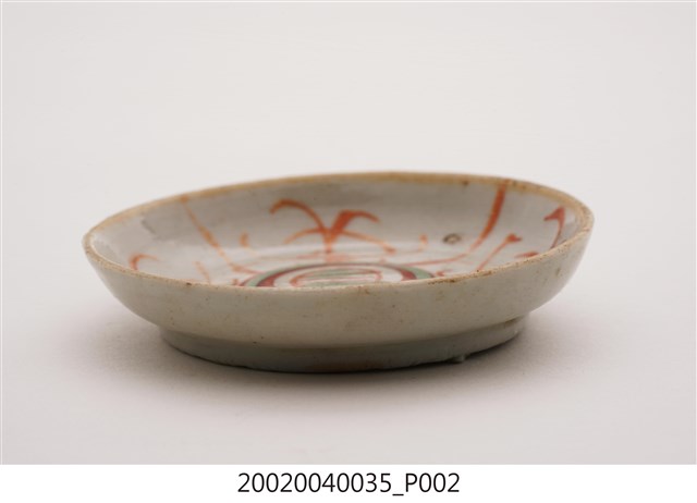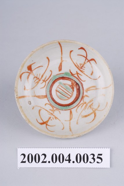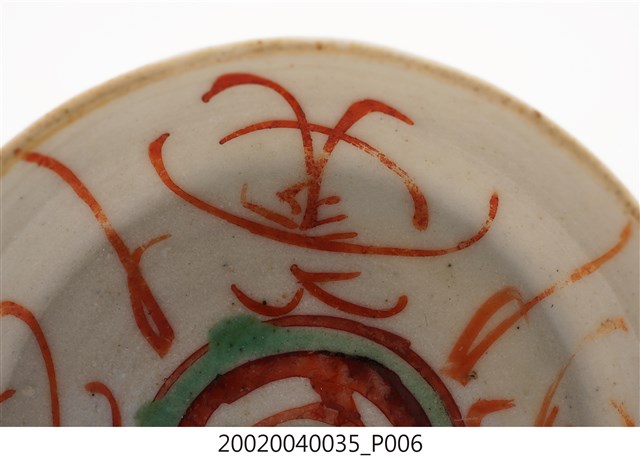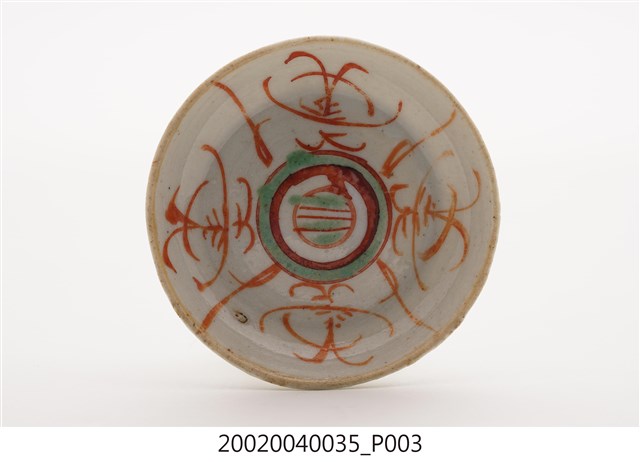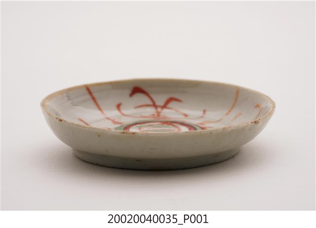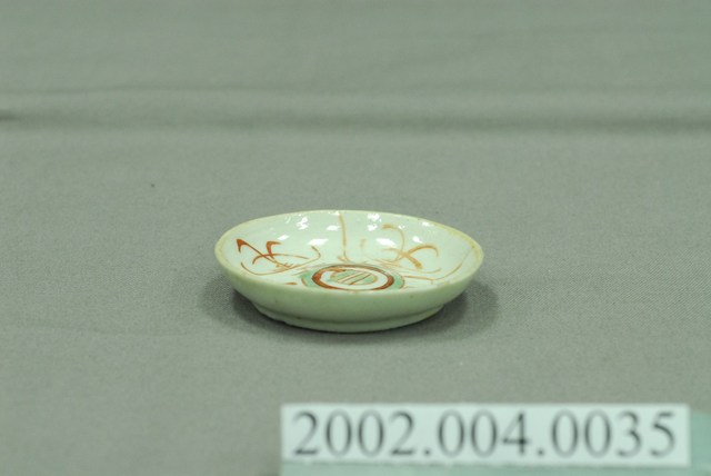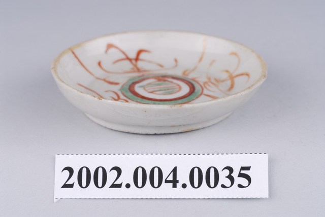 1.鬥彩蝴蝶紋小圓碟圓唇,平口,圓深腹,弧壁下收至圈足,矮圈足,圈足徑較大,平底刮釉露胎,胎色較淺,胎質略粗糙。全器施白色釉,唇口刮釉,釉料呈色乳白帶黃且質地濃厚,釉色光澤瑩潤,外壁有積釉,全器釉面多有經久使用的磕碰損傷等磨耗痕跡。主要紋飾繪於盤面,以胭脂紅釉繪四隻蝴蝶紋以及三個略施綠彩的同心圓,綠彩用量較多,因此多有溢出紅色圓圈之處。紋飾用筆逸筆隨性,整體以紋飾的線條粗細變化為主要表現。2.此類盤碟較尋常醬油碟來得深,通常作為盛裝小菜等配料的容器,是民間十分常見的日用器皿,因此通常以量產製造,裝飾多變