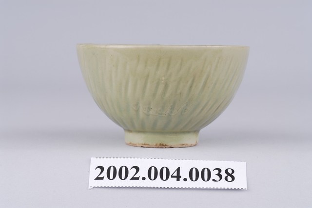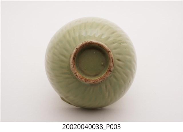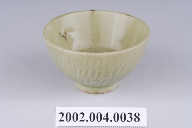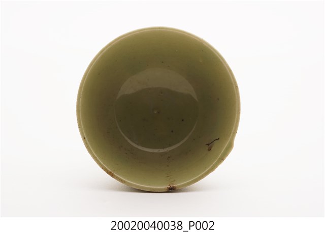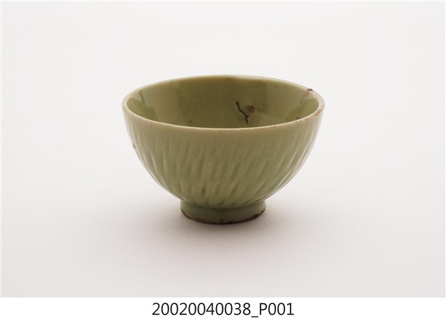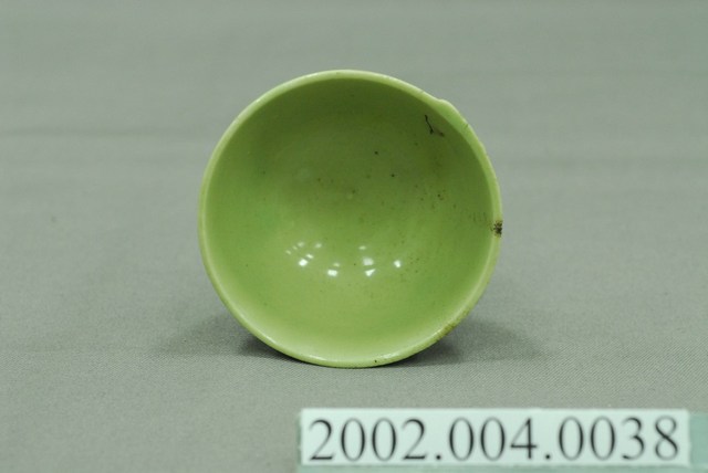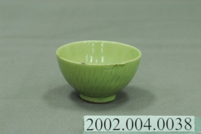 1.本物件應屬於臺灣傳統瓷器茶具,同一款式共有三色,分別是翠綠色、青綠色(偏白)、深綠色(偏棕),茶具保存良好,唯茶具內部有裂痕現象。外觀為單一釉色,沒有其他裝飾,僅用由上而下的豎痕作紋飾,若由底部看,則看似順時針放射狀。本文物在臺灣是非常易見的陶瓷種類,本文物一款茶具為敞口短、窄底圈足式造型。