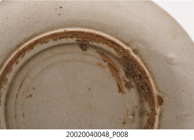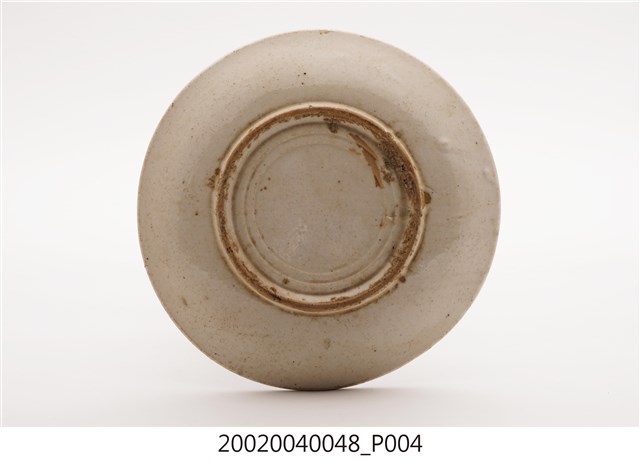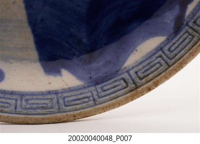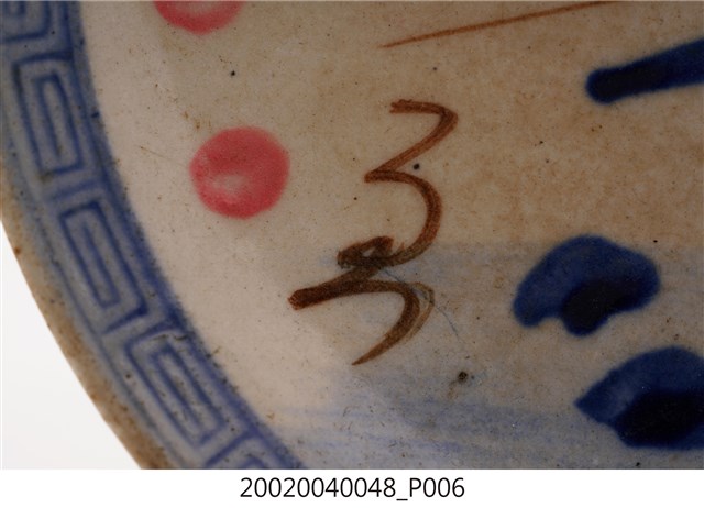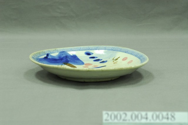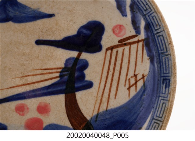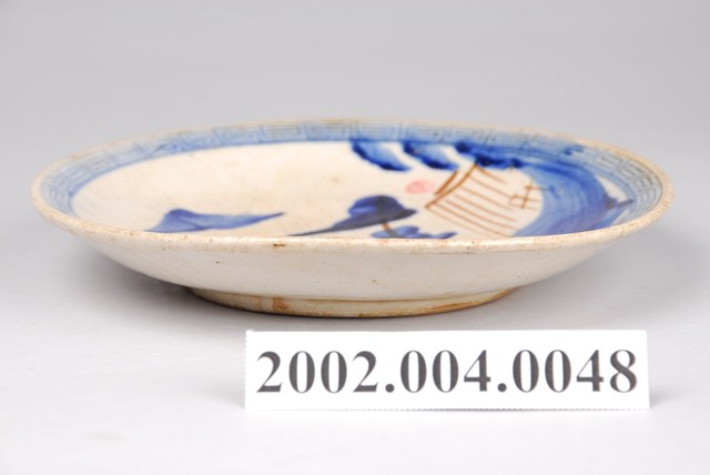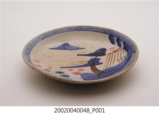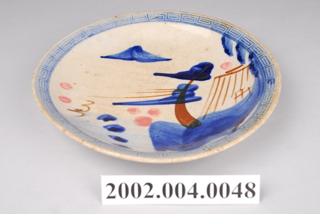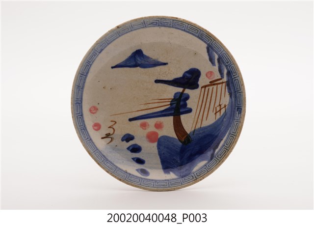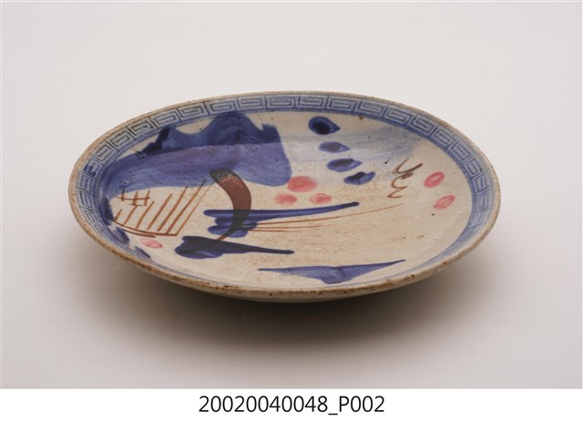 1.這件彩繪山水紋圓盤,是北投窯廠產製的日用陶瓷器皿。圓唇,敞口,弧壁,寬圈足。圈足胎厚,底部沾黏窯沙並有雜質沈澱。通體施釉,釉呈乳白色,盤面並以手繪及壓印方式裝飾山水圖案。近口沿處以壓印一圈回形紋,上填青花釉彩。盤心以手繪方式表現山水圖,以青花為主色調,搭配粉紅釉與褐釉繪波岸、樹林、屋舍、遠山、帆船等,運筆俐落,圖案簡單,近乎抽象。