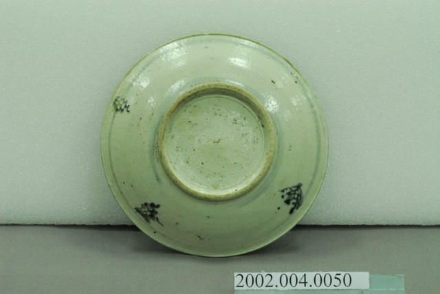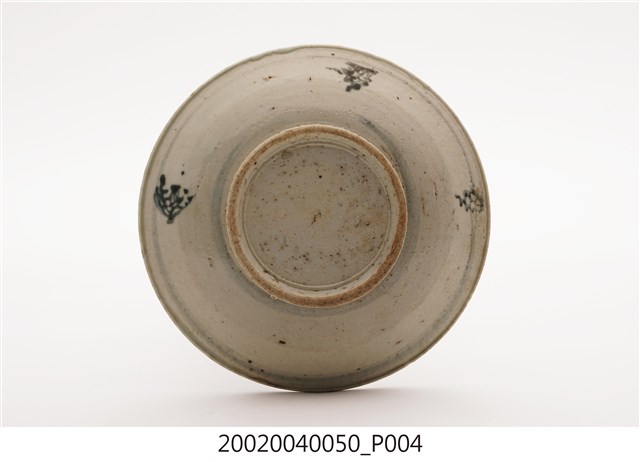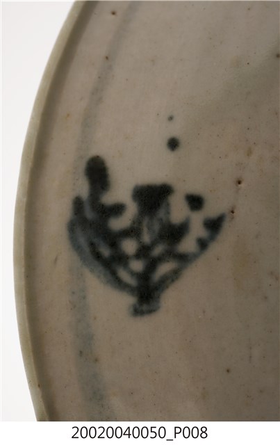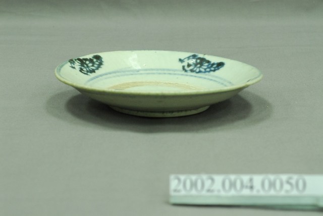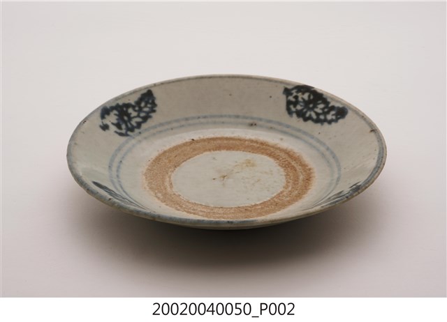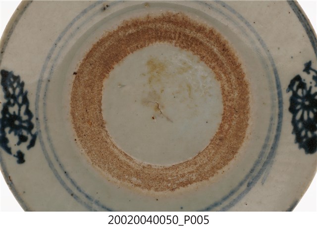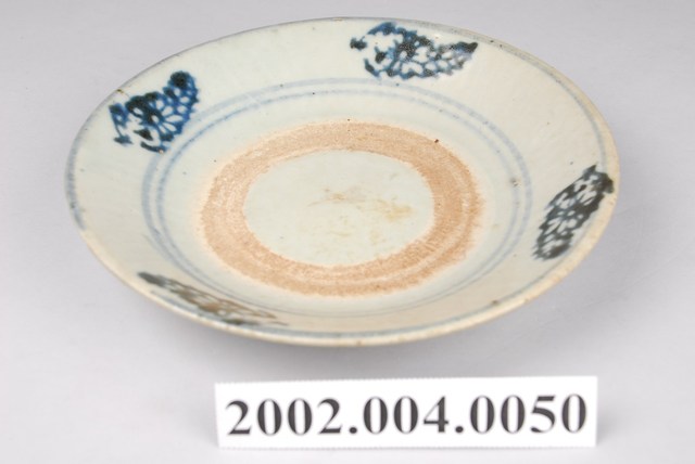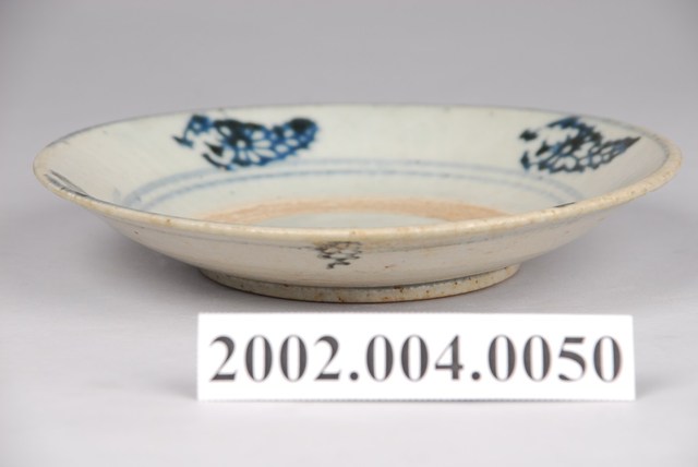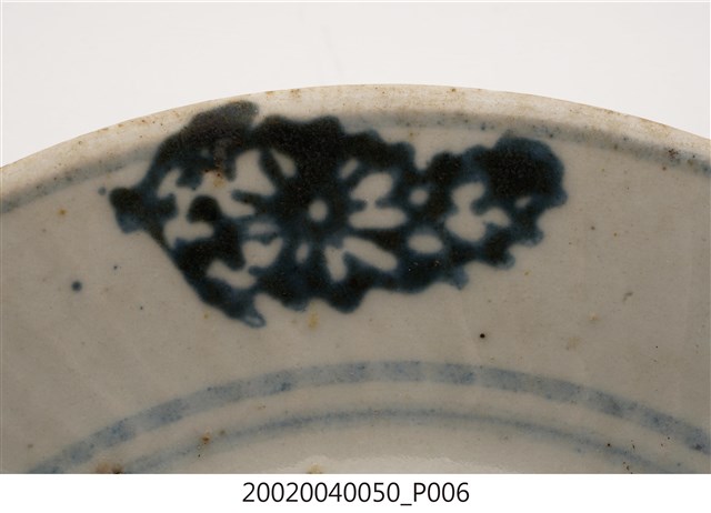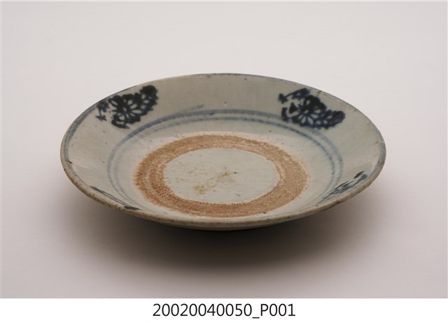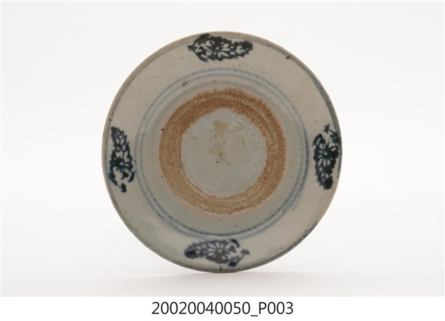 印青花花卉紋圓盤圓唇,敞口,淺腹,斜壁下收至圈足,矮圈足,平底,器底露胎,胎色深且有明顯的鏇胚及刮釉痕跡。全器施以透明釉後入窯釉燒,呈色白中微微帶黃、帶青,釉料光澤並不明顯。本件作品經高溫燒製因而在器表產生一些氣孔,並有少數雜質沈澱。因應疊燒入窯以縮減體積的工法在盤心處刮除釉料,為澀圈。主要紋飾以橡皮章沾取鈷藍釉轉印,兩兩相對布排於器內側壁,釉料發色較濃,顏色較深。口沿與盤心周圍皆以青花另繪圈紋,增添變化;外壁亦在靠近口沿處弦紋,另繪三株花草紋飾。橡皮章刻花卉紋,紋飾的線條十分簡單,經由重複蓋印形成較為繁