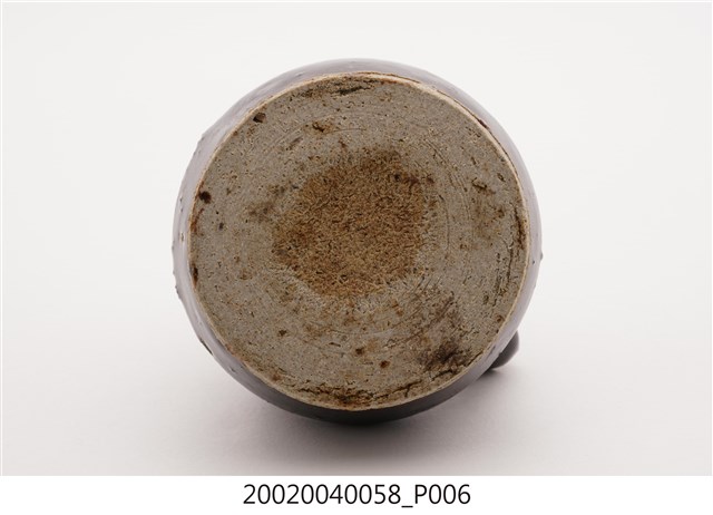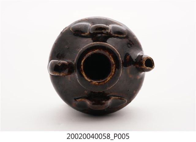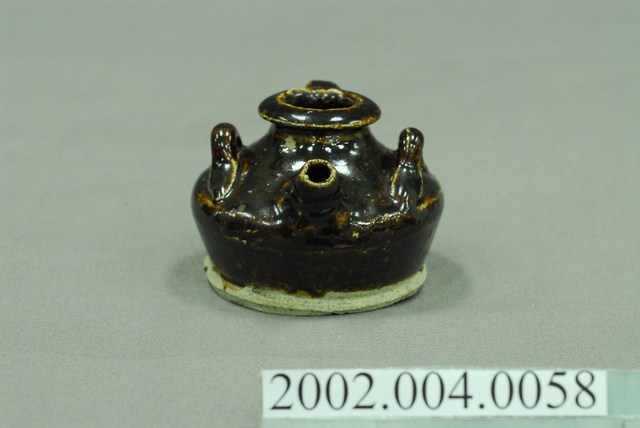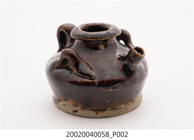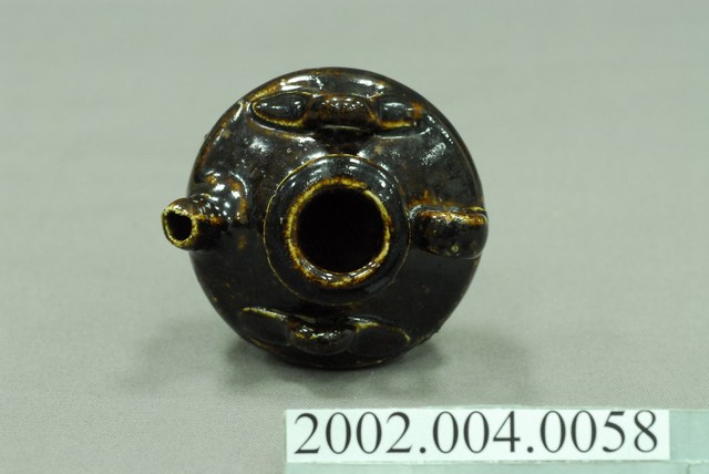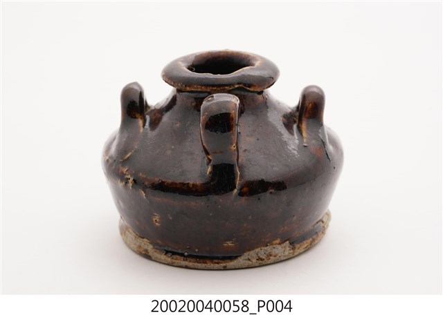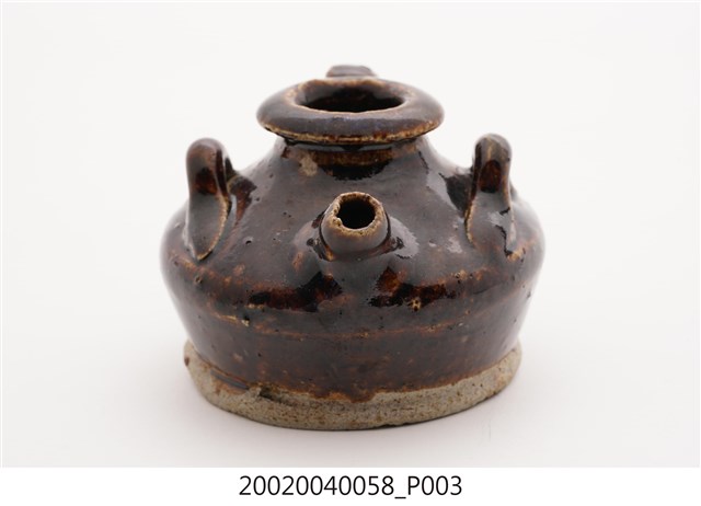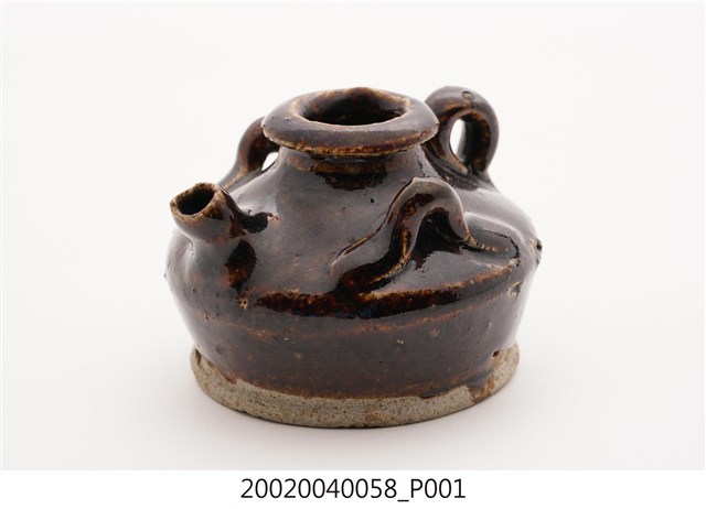 1.本件黑釉三繫耳油壺長7.7公分,寬7.3公分,高5.3公分,以陶瓷胎體於表面施以黑褐釉燒製而成,其底緣與底面不施釉。口緣呈現厚唇反折沿,短頸折肩,器身矮胖之平底盛器,器身正面帶有1流嘴,折肩上端左右側與後側皆做環形繫耳。2.本件油壺為添加燈油於燈盞使用,一般植物燈油多以罐盛裝,因此會分裝至油壺後,再以油壺的流嘴注入油燈。油壺也可做為婦女裝盛燻油,梳妝護髮使用。此外另有較為小型之油壺也可於流嘴塞入燈芯後,直接做油燈使用。