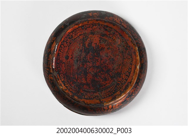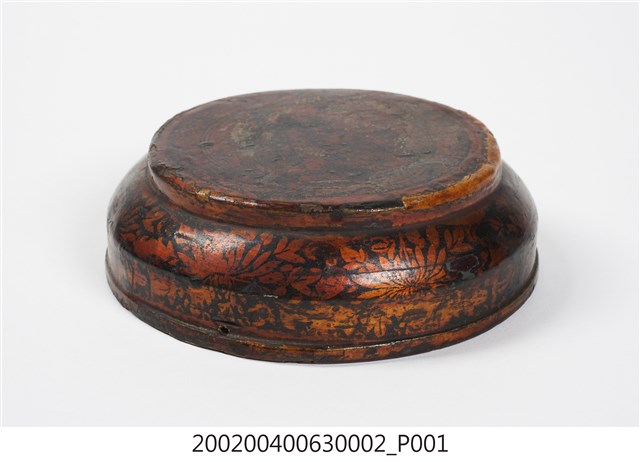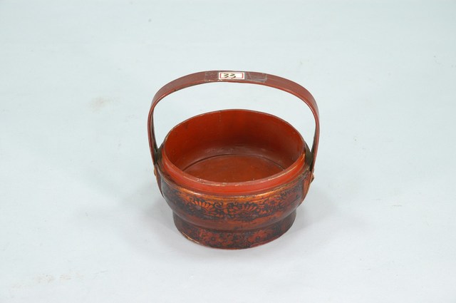 1.本件為附有提把、籃蓋的木製𣛮籃之籃蓋,表面上暗紅色漆,外表有菊花、梅花及其他花草等多樣紋飾,保存完整。 2.𣛮籃多以竹編製做,主要功能是供放置食物、祭祀品,精緻者髹漆圖繪做為禮籃。𣛮籃依需要做成大小不一型式,小者可以手提,大者在提把上做一圈孔,方便插入扁擔或棍棒兩人提扛。