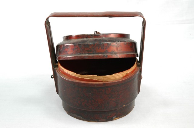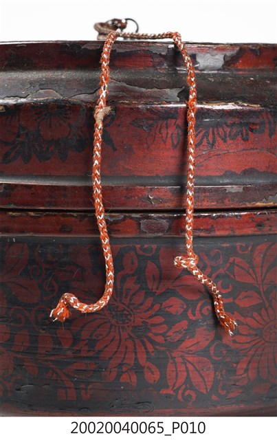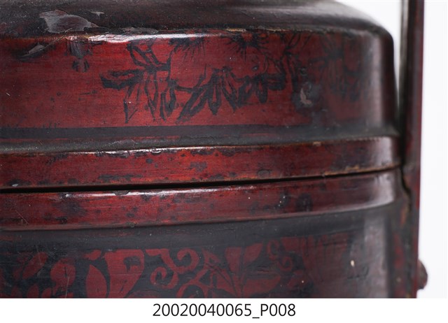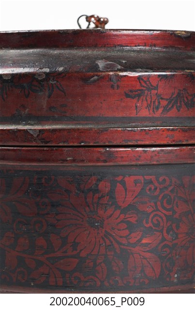 1.夲件𣛮籃為木製,上有蓋,內裡漆成紅色,外面則飾以漆染花草紋,籃身上緣已有破損。
