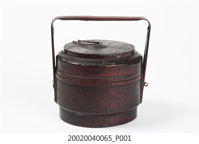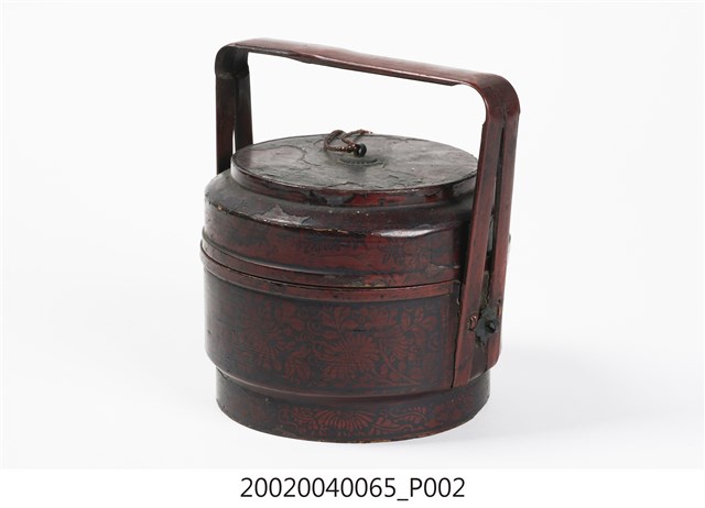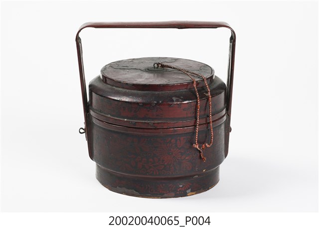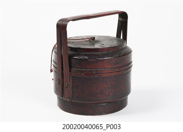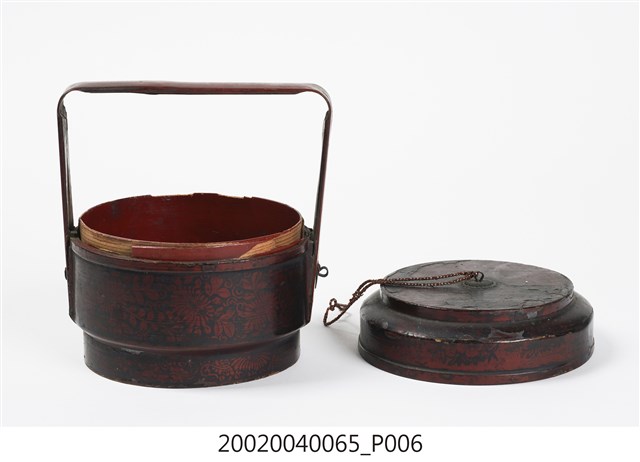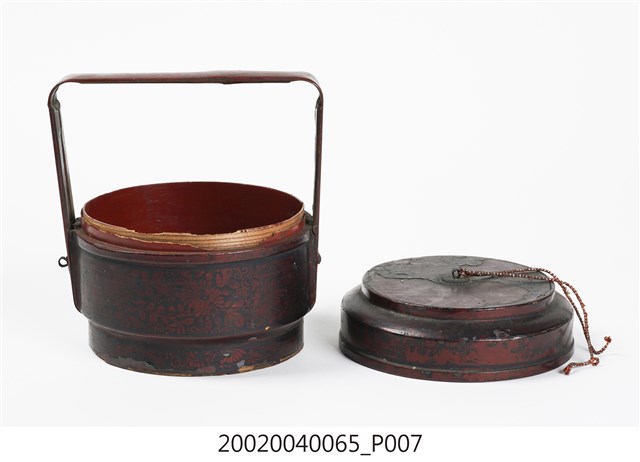 2.𣛮籃,常見有竹編或木製,夲件屬於後者。𣛮籃多使用在裝置食物或祭祀物,由於方便提取,是傳統民間生活中的一件重要的盛物容器。𣛮籃多以竹編而成,精緻者髹漆圖繪,作為禮籃。