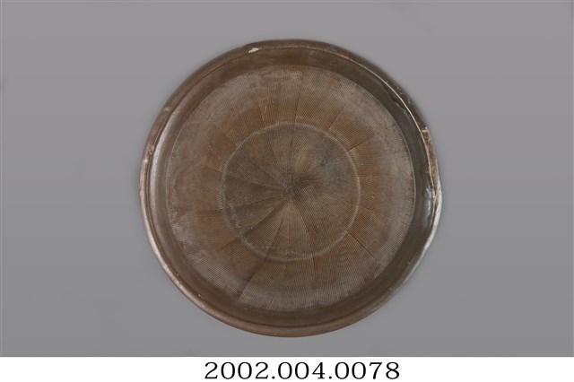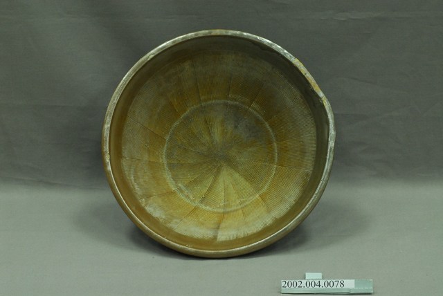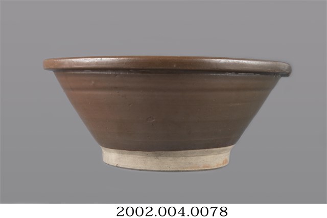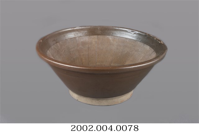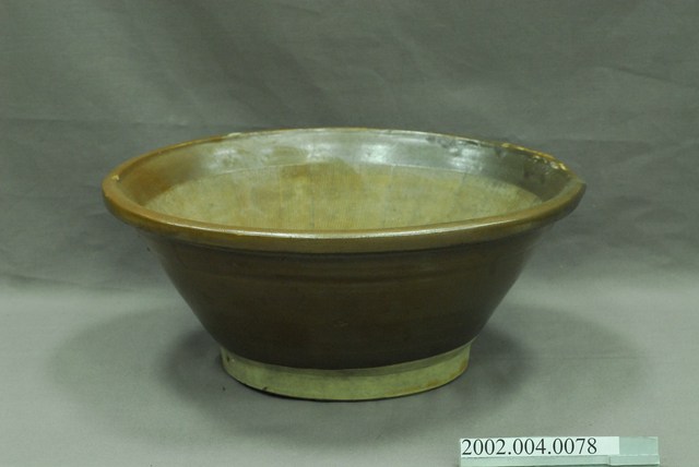 1. 醬釉磨缽為用來研碎物品的磨具,侈口,方唇,斜壁,圈足,整體呈倒圓錐形,口沿帶流,流呈圓弧狀。全器施醬色釉,釉不及底,圈足與器底露胎,胎色為紅褐色。外器壁素面無紋,器內刻劃均勻細密的篦紋,自中心向外呈輻射狀。2. 此類造形的研磨器約在20世紀前半由日本人引進,又稱「日式磨缽」,用於研磨味噌或日式食品。經過學習後臺灣的窯廠開始燒製此類陶器,臺灣人用來研磨米麩後煮來餵食孩童。近年來這種磨缽被運用於臺灣北部竹、苗地區客家族群的「擂茶」活動中,聯繫了閩、粵地區客家傳統擂茶文化。