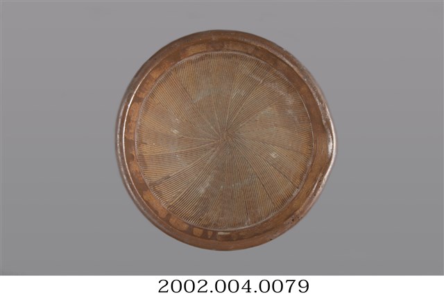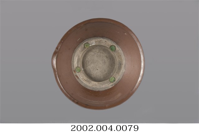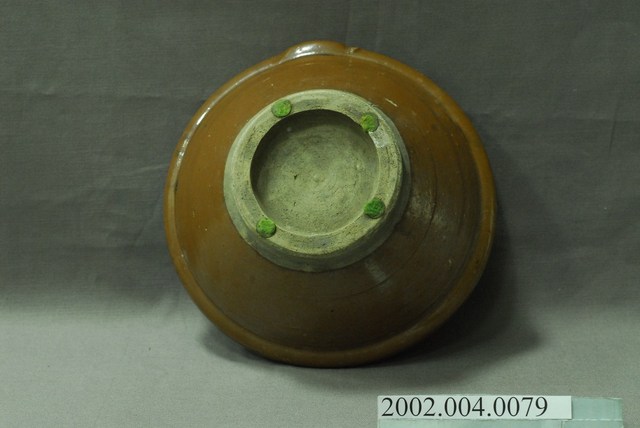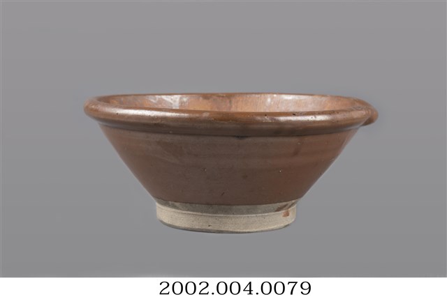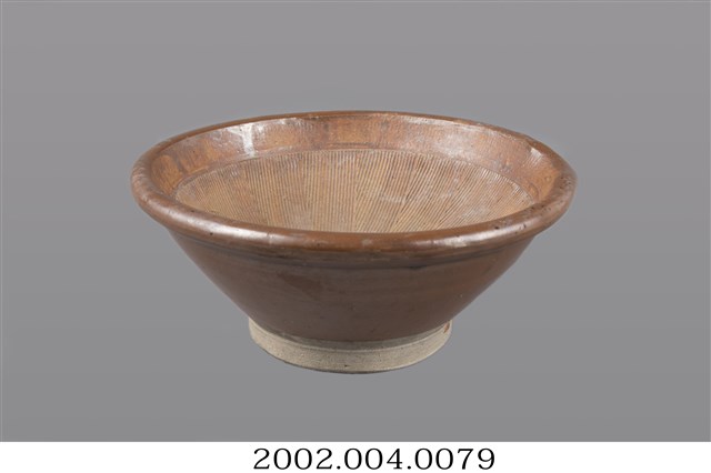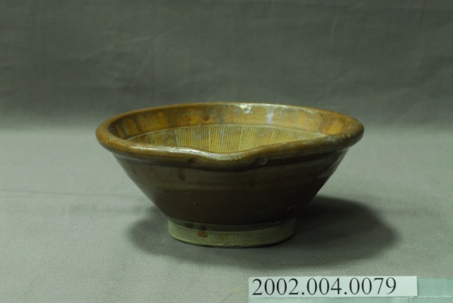 1. 紅褐釉磨缽為用來研碎物品的磨具,侈口,厚圓唇,斜壁,圈足,整體呈倒圓錐形,口沿帶流,流呈圓弧狀。全器施紅褐色釉,釉不及底,圈足與器底露胎,胎色為紅褐色。外器壁素面無紋,器內刻劃均勻細密的篦紋,自中心向外呈輻射狀。圈足底黏貼四個綠色小圓形墊片,應有止滑的作用。2. 此類造形的研磨器約在20世紀前半由日本人引進,又稱「日式磨缽」,用於研磨味噌或日式食品。經過學習後臺灣的窯廠開始燒製此類陶器,臺灣人用來研磨米麩後煮來餵食孩童。近年來這種磨缽被運用於臺灣北部竹、苗地區客家族群的「擂茶」活動中,聯繫了閩、粵
