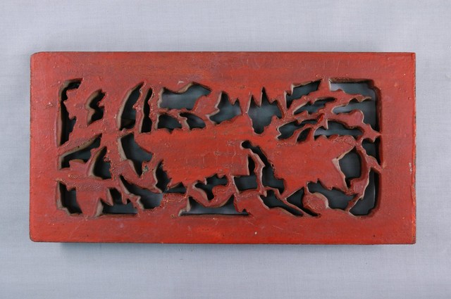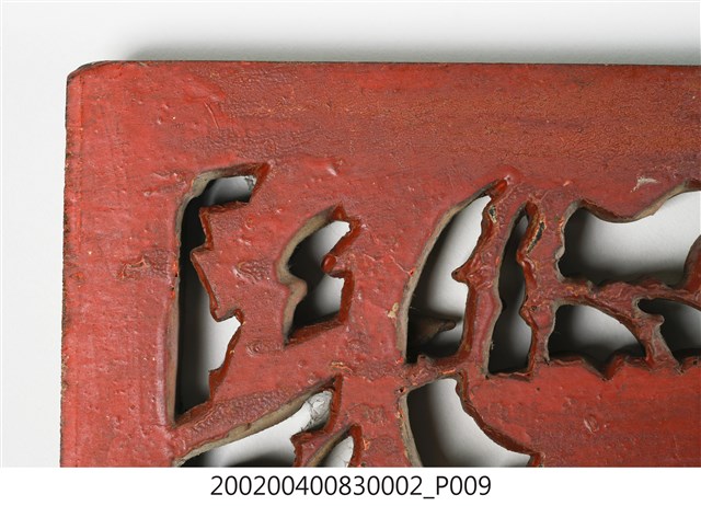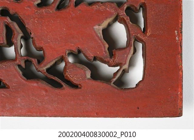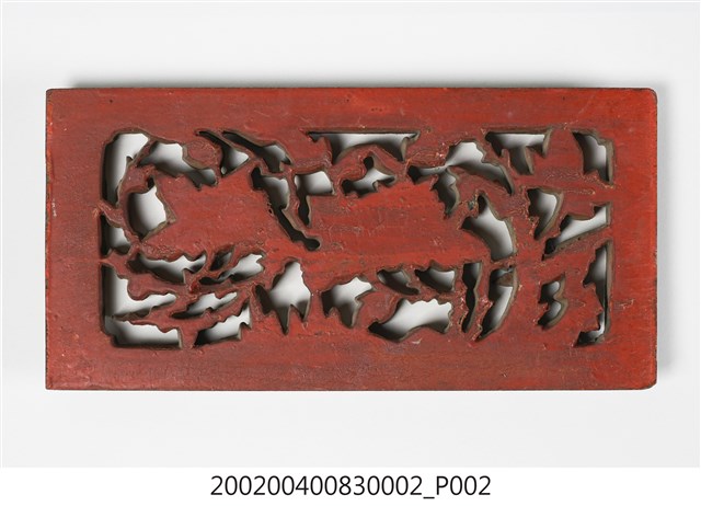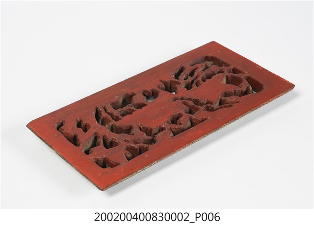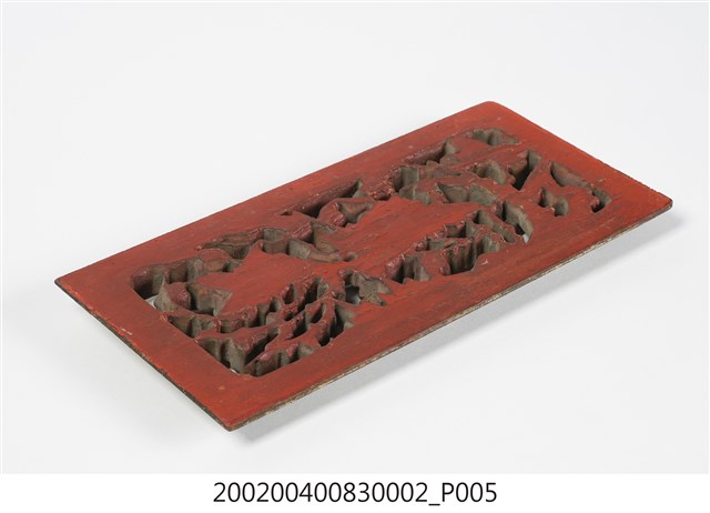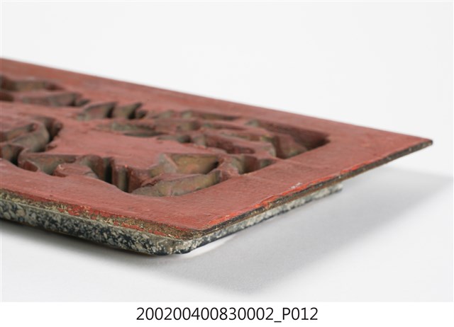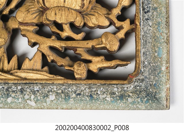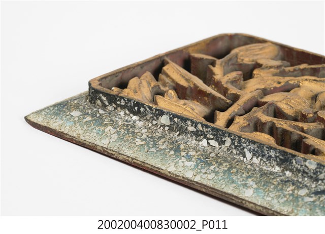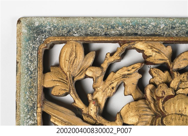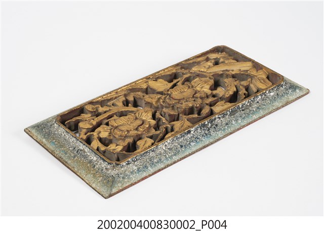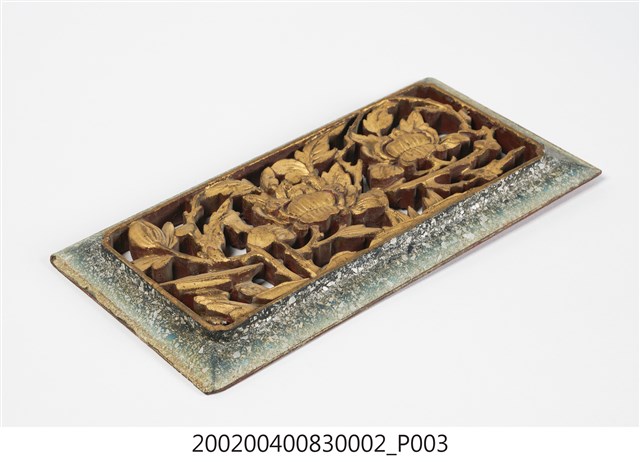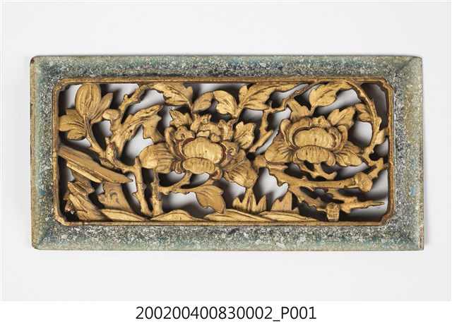 1. 本藏品是一對長方形木雕板堵中的一件,長27.4公分,寬13.6公分,厚2公分。2. 方形的邊框上是以青綠底漆搭配白色螺鈿片做為裝飾,中央堵心則是金漆鏤空木雕,皆以枝葉繁茂的牡丹為主題,在底部的左側刻有奇形怪狀的壽石,牡丹代表富貴,壽石則有長壽之意,皆具有吉祥的意味。