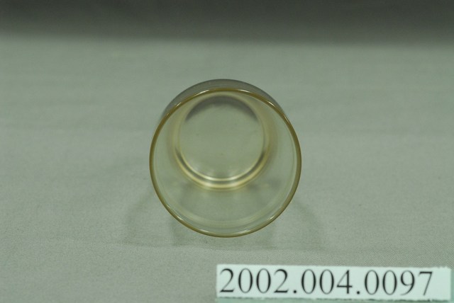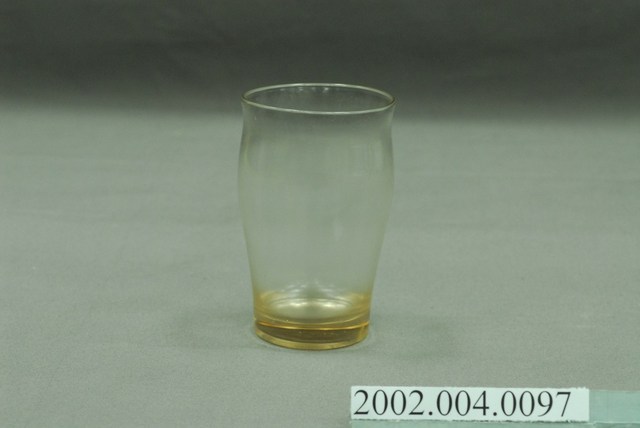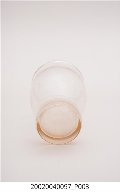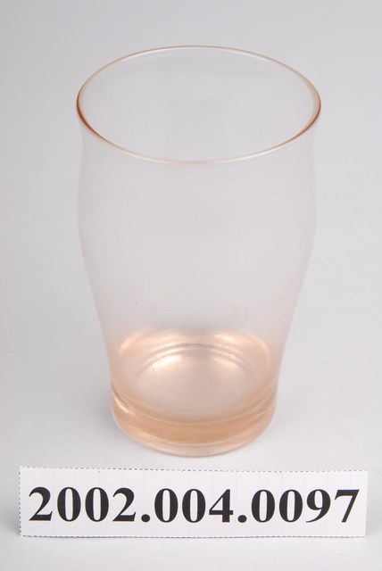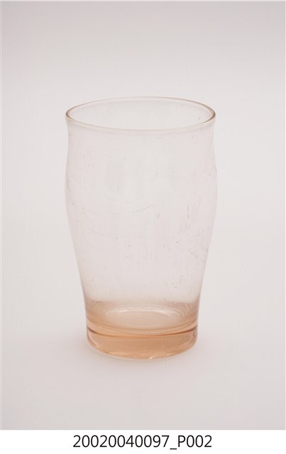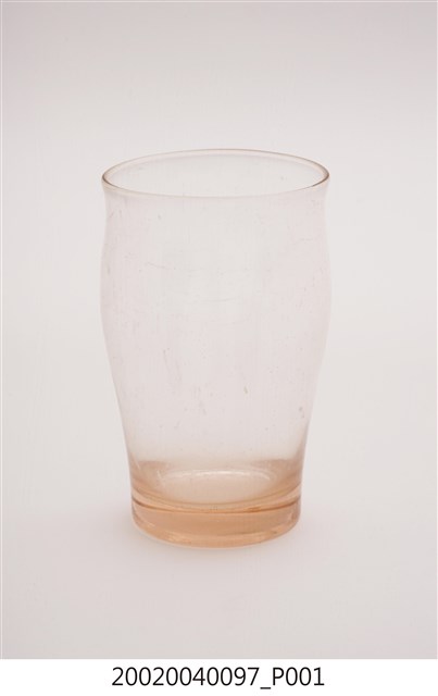 1.此件玻璃杯由淺粉色玻璃製成,整體呈微曲線圓柱形,長約6.3公分,寬約6.3公分,高約公分9.7。外型由杯緣開始向下微縮,至中段以上微凸,接著向內縮至杯底,杯底厚實。2.臺灣在早期民生用器具多由陶、瓷製成,玻璃製品屬珍稀進口物品,多為上層社會人士所用。直到日治時期受總督府西化、現代化的影響下,引進與開發玻璃產業,玻璃製的日常用品才漸普及於社會大眾,而用玻璃杯喝飲料成為一時的風尚流行。