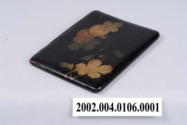 本文物為漆器化妝盒蓋,背景為黑色,上有黃色及橘色的菊花圖騰。女性臉上的妝扮為其對特定生活 之想像,相對地女性之美也時常受限於社會傳統價值觀,妝扮女性的化妝品及其附屬產品,則體現了社會審美觀和科技的變動。