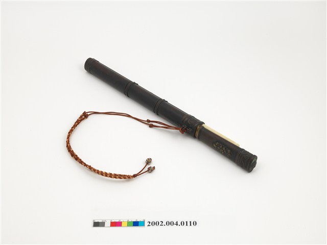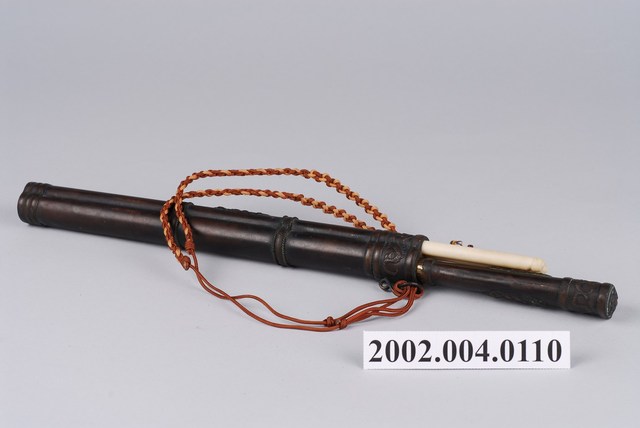 3. 深褐色木雕刀鞘,外型呈直筒狀,內部挖鑿收納小刀及筷子之圓形插槽,外表磨製光滑,僅於頂部及中段雕刻龍紋裝飾,頂口處綁附紅黃雙色編織提帶,提帶尾端穿串2顆白底多彩琉璃珠作墜飾。