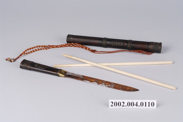 1. 象牙筷刀具組,共1組3件,包括象牙筷子1雙、小刀1支、木雕刀鞘與筷子套1件。