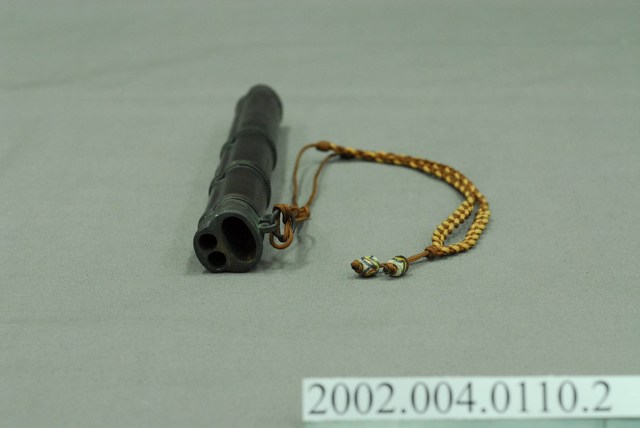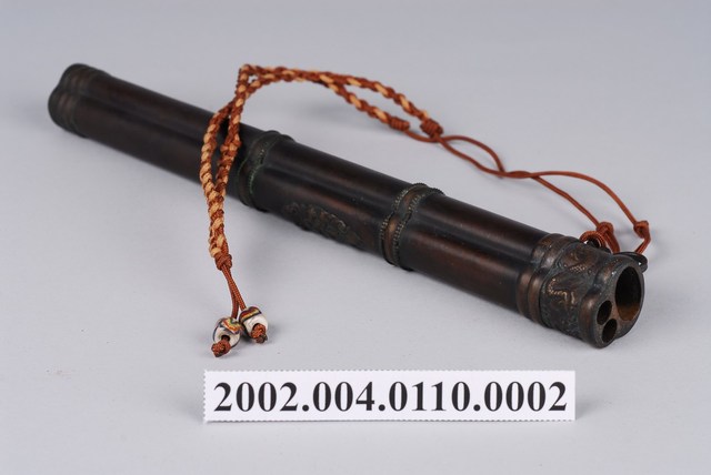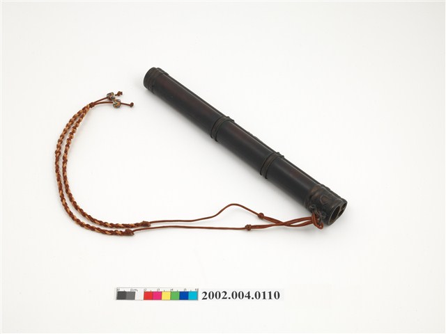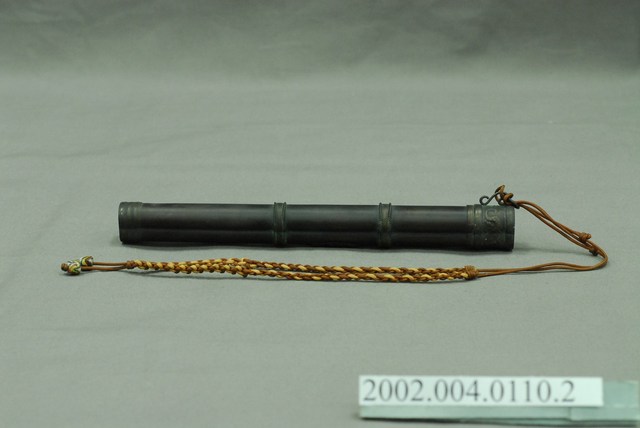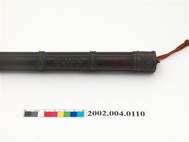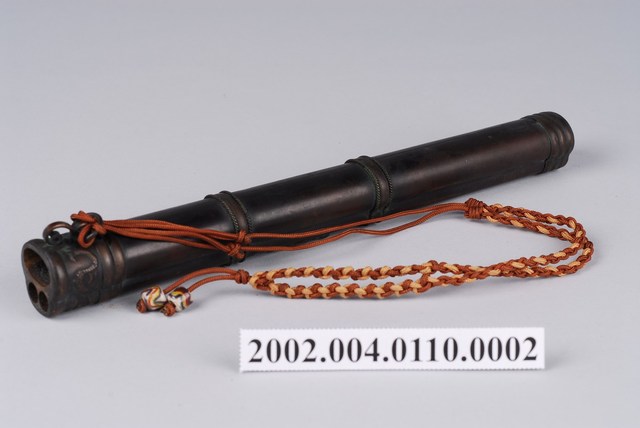 深褐色木雕刀鞘,外型呈直筒狀,內部挖鑿收納小刀及筷子之圓形插槽,外表磨製光滑,僅於頂部及中段雕刻龍紋裝飾,頂口處綁附紅黃雙色編織提帶,提帶尾端穿串2顆白底多彩琉璃珠作墜飾。