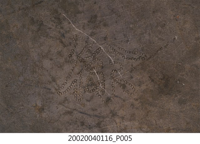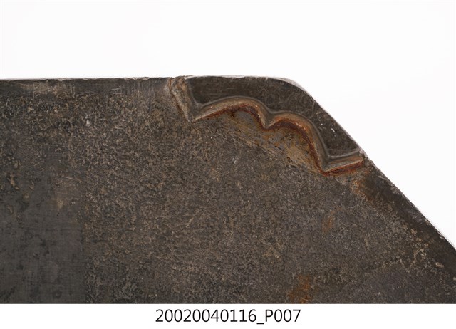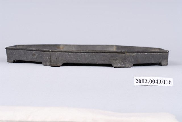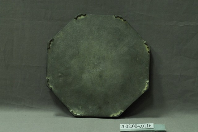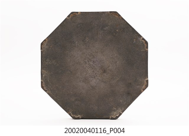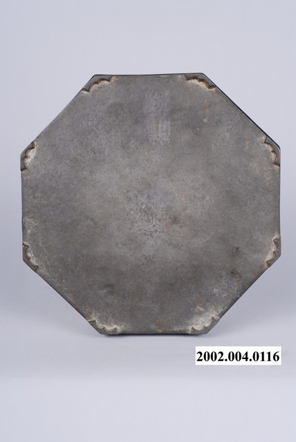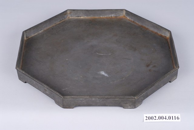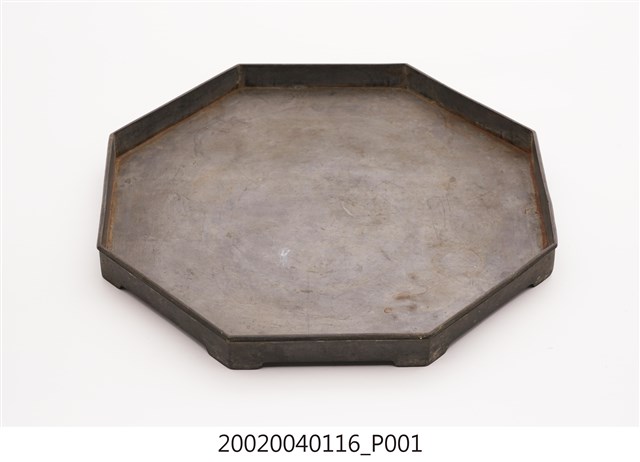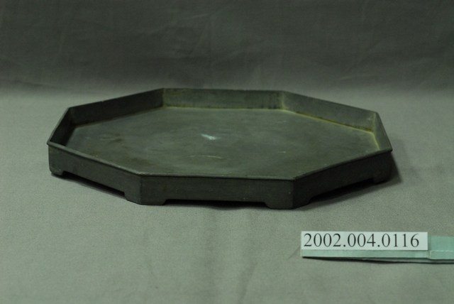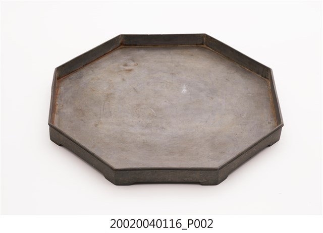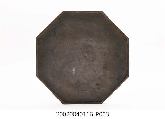 本件徐字八角錫茶盤以錫金屬製作,呈長27.9公分,寬28公分,高2.7公分之淺盤狀。外觀呈霧面深灰色,底面作八角形平底,口緣處同樣呈八角形,邊緣帶唇,盤身短淺,器壁呈垂直狀,盤底各於八角端處作ㄑ字形之板足。外側底面以連續圓點連城字形外框的方式,敲打出「徐」字樣。對照購藏對象為徐翠嶺女士,推測應為徐姓家族另外註記之擁有品。本件茶盤主要用來放置茶壺與茶杯之托盤。