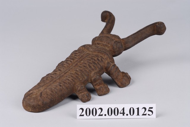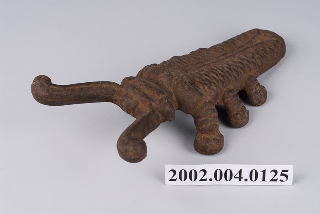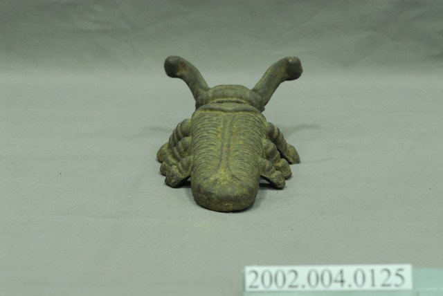 1.本藏品為金屬製檔門器物,長21.9公分、寬10.7公分,高6.5公分,根據器身的分模線判斷為金屬鑄造之器物,其外型具有凸出的雙眼,長長的觸鬚,修長的身體而有六隻腿足,應為昆蟲造型,傳說此器為檔門之用,又稱鐵怪獸,整體給人古拙穩重之感。