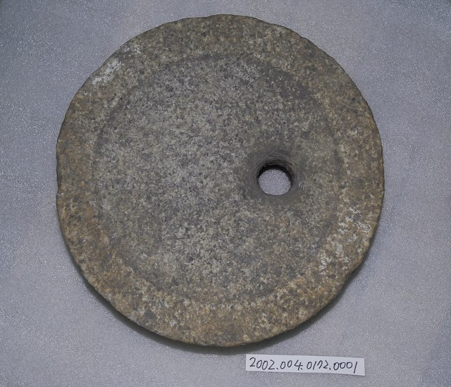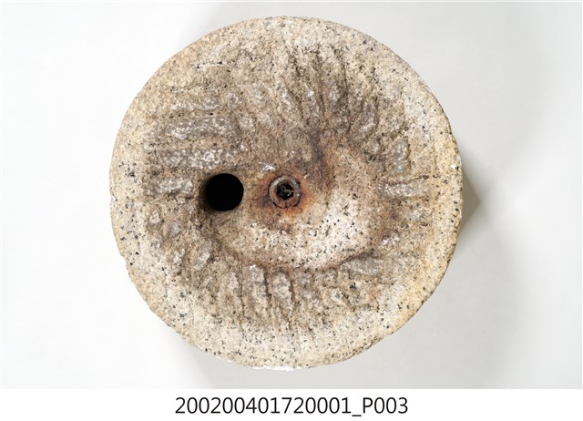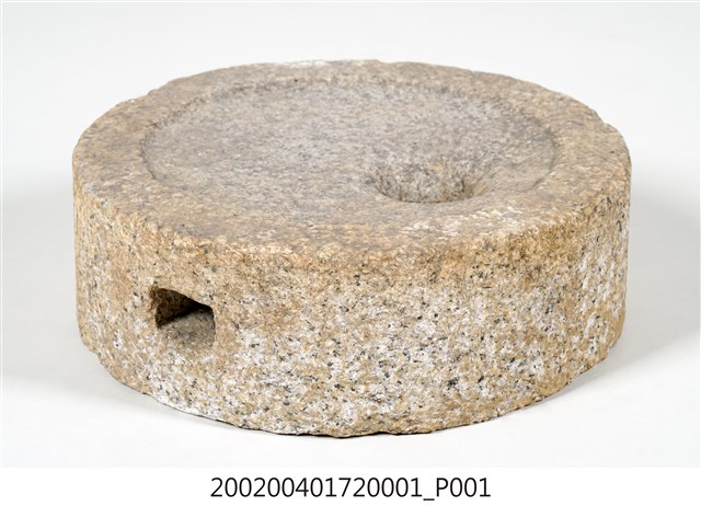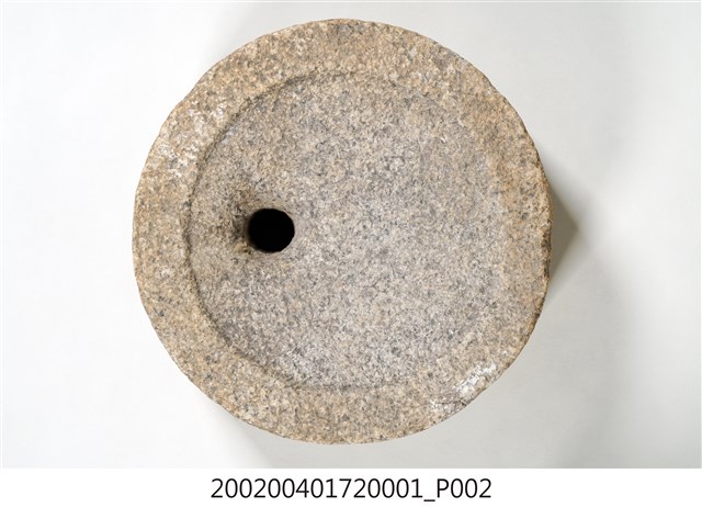 本件為石磨結構的上座部分,呈圓餅狀。頂部的周邊有一圈較高的圓環,由環邊向一側孔洞處漸凹陷,其作用是防止投入的豆穀向外傾洩;由頂部貫穿至底的圓形孔洞,是浸泡好的豆或米的投入口;邊壁一方形的孔洞做為榫接木製磨把之用。因經久使用與年代久遠,轉折稜角處除了有部分破損也呈現較平緩滑順狀態,表面有明顯粗糙感與泥塵沾污。