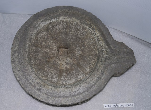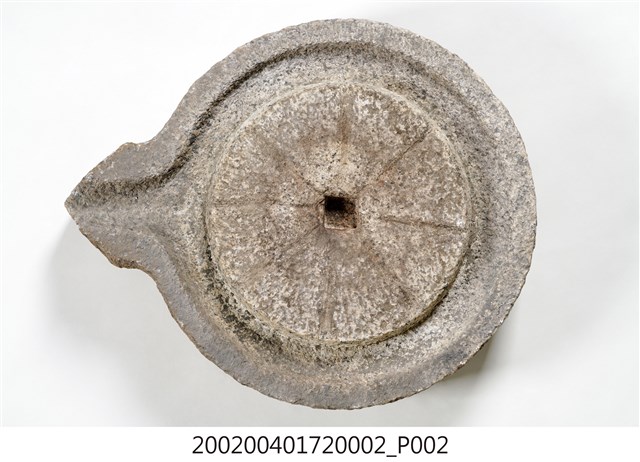 本件為石磨結構的下座部分。下座中間圓餅狀的凸起部位略小於承接的上座部位的周直徑,頂部中間的方形孔洞為軸,與上座底部的孔洞相合,稱為「石磨心」;軸心四周有八道磨損嚴重的放射狀溝紋;底座周圍有環狀的溝槽,溝槽設計由後向前略有傾斜度,至流嘴處最低,溝槽結構以下部分頗為厚實,有助於研磨石的穩定性;流嘴開口處的末端呈「﹀」狀的尖形且略為向外撇出,此種造型設計可利於研磨出的漿液集成束流狀流至承接的粿袋或桶中。因經久使用與年代久遠,轉折稜角處除了有部分破損也呈現較平緩滑順狀態,底座的環形溝槽周邊有明顯粗糙感與黃色塵泥。