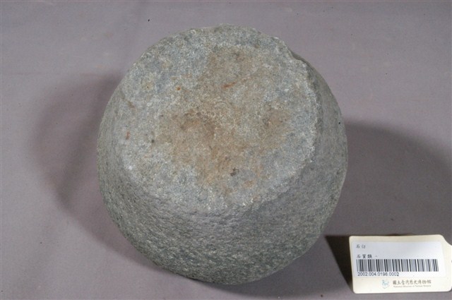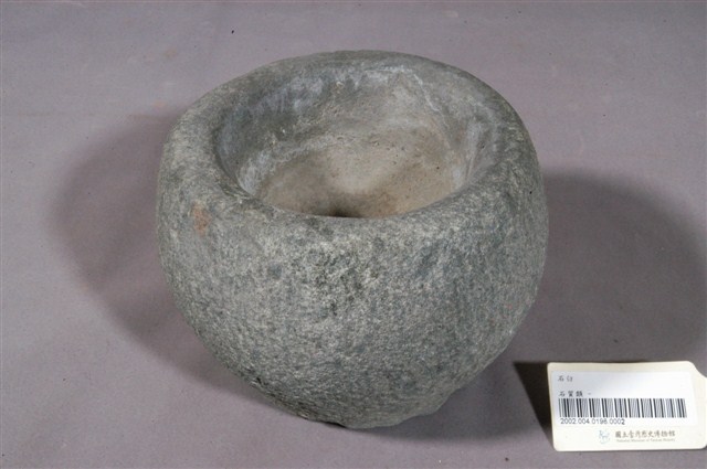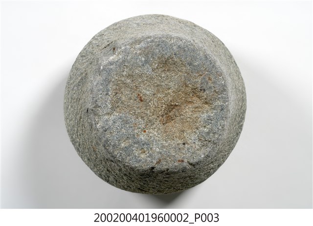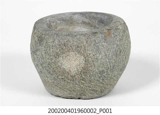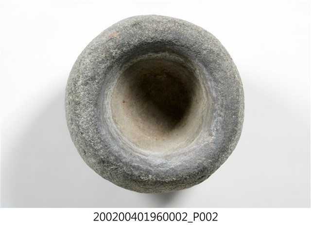 1.本件為一套完整小型碗缽造型石舂臼的石臼部分,中間鑿挖成深坑凹槽,用以盛裝欲搗碎的物材。因經久使用與年代久遠,凹槽內部呈現圓滑的磨損狀況並且殘留不同色層的淺色灰白漬痕;臼身上緣與外部有明顯的粗糙感;下端外緣有些微破損;底部有些微泥塵沾污情況。2.此類小型的石舂臼主要是用來舂米製成粉麩或是「土豆麩」(花生粉)、蒜頭、檳榔等,也可用來舂搗青草藥。舂臼是臺灣早年農業社會常見的食材加工器具,小型的石舂臼至今仍繼續有在中藥房或廚房裡被使用著。