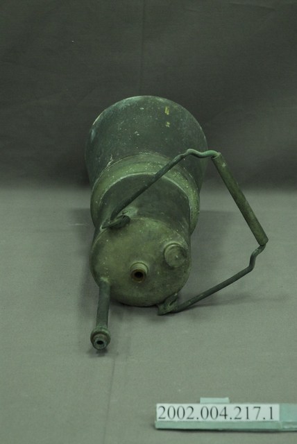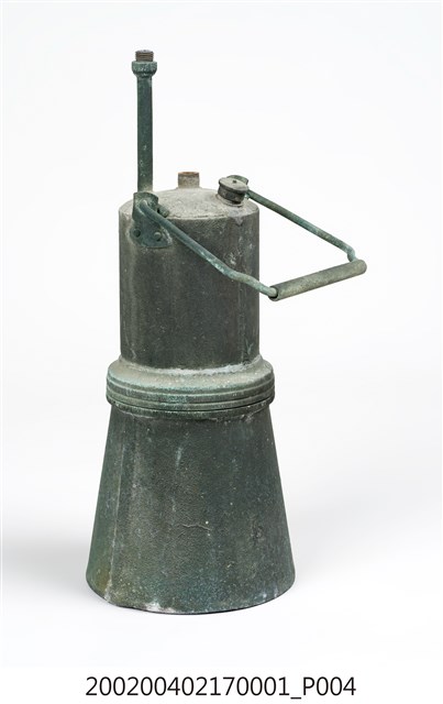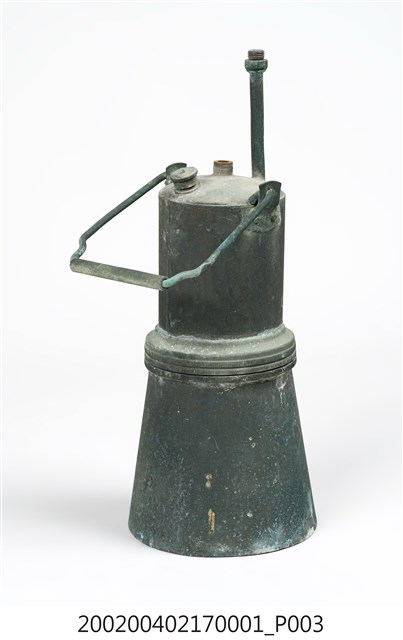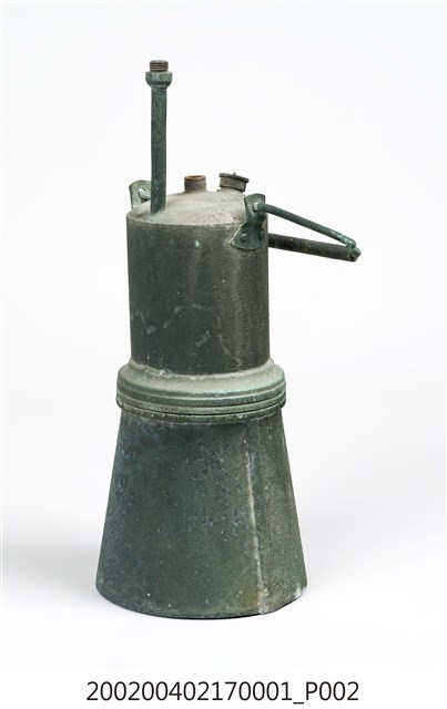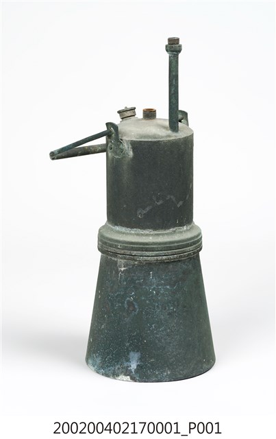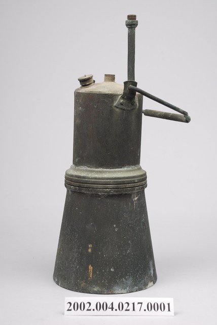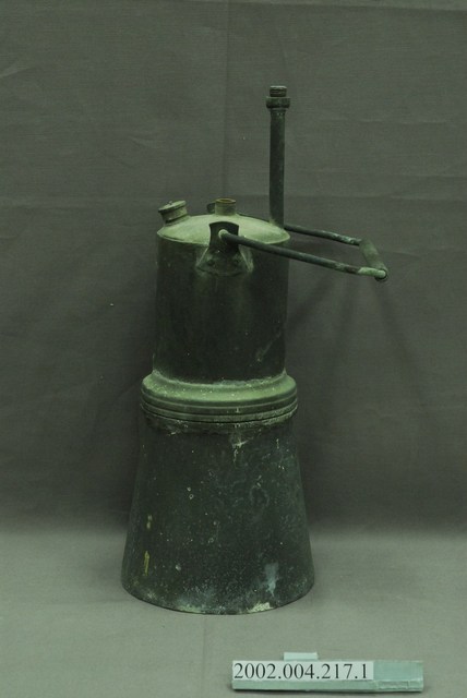 本件錏鉛製長桿電石燈座身為部件之1,可分為上座與下座2部分。上座呈現圓筒狀,頂面中心處為水流調節裝置,左右兩側分別為帶有旋蓋之注水口,以及乙炔氣體輸出桿,兩側邊帶有立耳,以金屬條折拗成ㄇ字形座提樑式把手。下座呈上窄下寬之圓筒形,內部可放置電石,上下座接合內墊環形橡膠圈,以旋環式之構造密合。