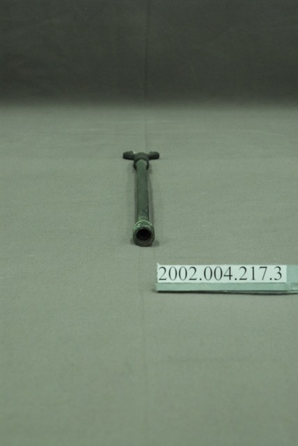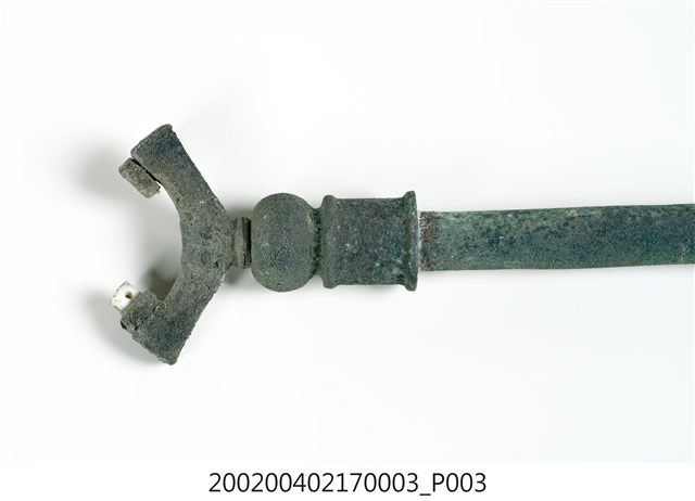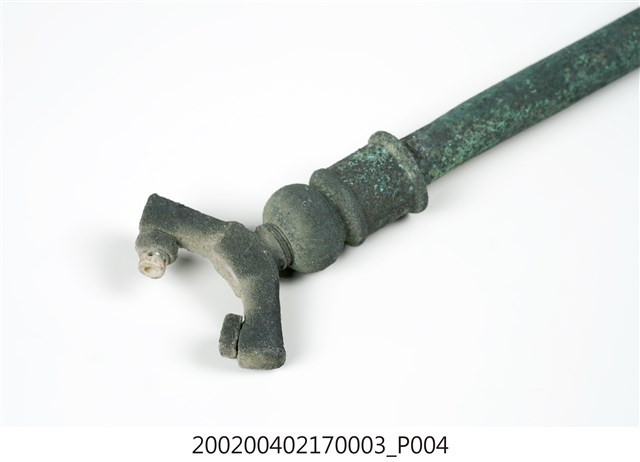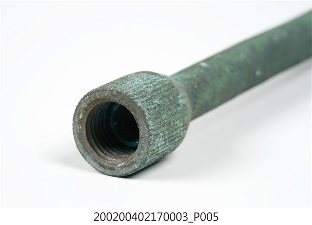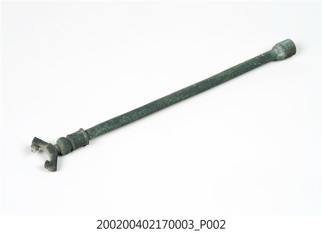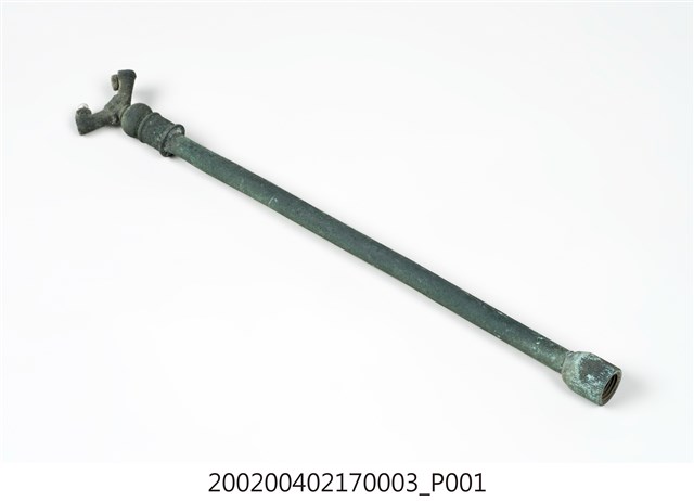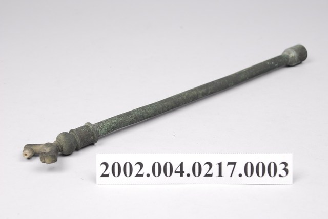 本件錏鉛製長桿電石燈燈桿為部件之3,外型呈現空心長棒狀,長桿頂端以套筒上接圓球體,再作C形雙口噴嘴裝置,乙炔透過噴嘴輸出,用火點燃噴嘴即可作照明使用。燈桿末端為略大的套筒形,內壁帶有螺絲旋紋,可與上座之氣體輸出桿作旋轉接合。