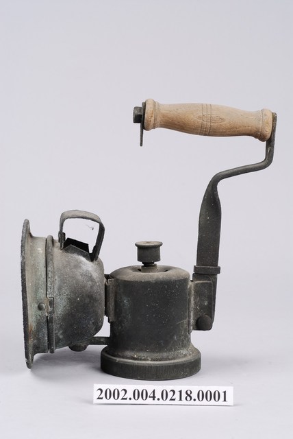 本件錏鉛製電石燈上座為部件之1,可分為手把、座身、水流調節裝置、噴嘴與燈罩。座身呈現圓筒形,頂端中心處帶有旋鈕式水流調節裝置,透過旋鈕可控制水流滴下的速度,旋鈕四周呈凹陷狀,周圍帶有圓形孔洞作注水口之用,底緣略寬,內壁帶有螺絲旋紋。上座正面置掛有燈罩,燈罩呈深碗狀,口緣折沿,底部挖有圓孔,可套入噴嘴。噴嘴由上座下段伸出,作L字形。手把由上座背面固定,以錏鉛長板折拗扭轉呈7字形,於頂端增加木製握把。