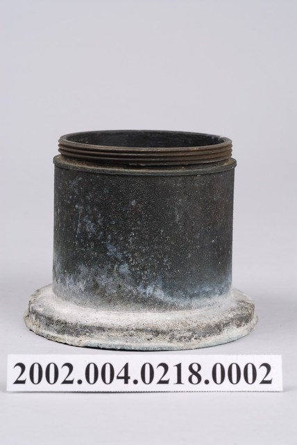本件錏鉛製電石燈底座為部件之2,底座呈現圓筒形,口緣外壁處帶有螺絲旋紋,底座略大於器身呈扁平圓餅狀。電石燈外表氧化呈深灰色,惟底座部分帶有白色附著物。底座主要裝盛電石之用,水滴由上座滴下後,於筒內做化學反應,產生乙炔氣體。使用時上下作旋轉接合,防止氣體外洩。乙炔會因為氣體壓力,往噴嘴口輸出。