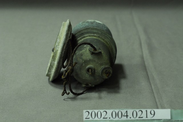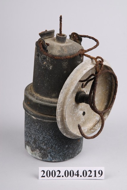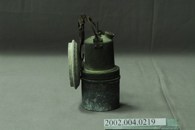 1.本件錏鉛製電石燈可分為上座、底座、燈罩與提把4部分,整體外型呈現長形圓筒狀,底座較上座略寬,主要放置電石。上座頂面中心處突起,原作水量控制旋鈕佚失,另以鐵絲插入控制。頂面後方圓蓋為注水口,正面接近底緣處有噴嘴口,外罩經後人加工製作之鋁製燈罩,燈罩以茶壺壺蓋部分去除壺鈕完成。上座左右兩側帶有立耳,以鐵絲拗製提樑,上接圓環與S形掛鉤。上座與底座組合以內側帶有螺絲旋紋之轉環接合。2.臺灣早期在電燈尚未普遍的時代,係以油燈、蠟燭、電石等做為夜間照明工具。本件電石燈係以下座放置電石,又稱電土,為碳化鈣(CaC