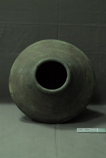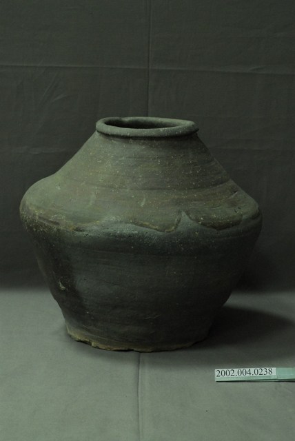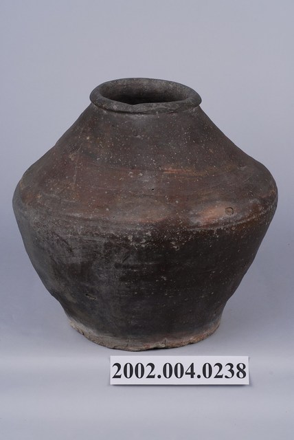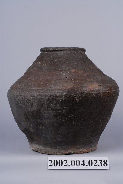 厚唇束頸折肩罐,圓口,扁尖唇,唇口下方略向內凹,頸部圓弧內凹,全器最大徑在肩腹交接,約在器身中央二分之一處,向下斜收至底部,器身略向一側歪斜。肩部有些許自然落灰釉附著,胎色為灰褐色,應屬粗質高溫陶器,外器壁施一層搏的深褐色釉,釉不及底。相對定年在19世紀的澎湖將軍一號沉船、1822年沉船得順號(Teek Seeum),出水不少這類陶罐,尺寸不一,多為無釉,但因溫度控制不佳,有的燒成紅陶,有的成為灰陶。