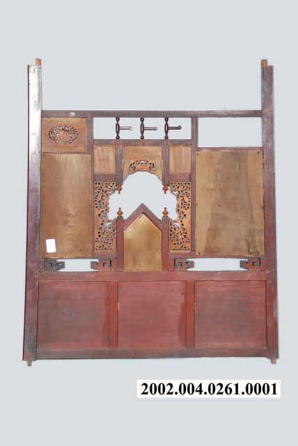 1. 本藏品為漢和洋風八腳紅眠床的左遮風部件,長4.4公分,寬146公分,高173公分,通體多上朱漆,左右兩端為方形床柱,床柱上皆有卯眼,上下則有榫頭,用以連接其他部件,兩柱之間則有多層板堵與裝飾雕刻等組成的密閉式高遮風。2. 在細部裝飾上,最下層為實心板堵,四周墨繪一圈連續洋風花草紋。板堵上中央有西式教堂造型木框鑲嵌彩繪玻璃畫,畫作的題材為傳統壽石菊花鳥蝶的吉祥圖像。教堂型玻璃畫上方為透空,透空周圍則有木雕垂花飾板,下部左右兩側為透雕瓶花題材,上部中央為拱形剔地淺浮雕,題材為草花裝飾,拱圈下方則有布簾草鏤空雕刻,上部左右兩側剔地淺浮雕花草飾板。左右兩側為方形木框鑲嵌彩繪玻璃畫,題材皆為仕女圖,右側為高髻傳統漢服的女性形象,左側則為清代旗袍短髮女性圖像。最上層中有三個車枳木掛勾,右側則為桃形中央鏤空花籃紋樣木雕。