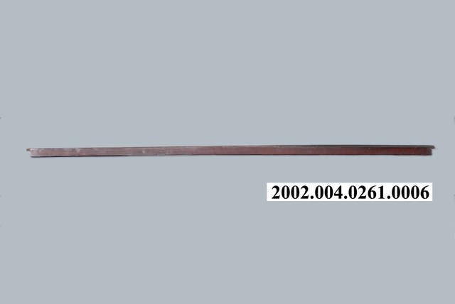 1. 本件為漢和洋風八腳紅眠床的𨑨迌樑,位於紅眠床左右遮風前方上端,透過榫頭固定在左右遮風床柱上。整體造型簡單,通體施以紅漆,除此之外並無裝飾。2. 在臺灣傳統漢人建築中有𨑨迌樑之稱,一般指建築的弓形前簷梁,又稱之為壽樑。紅眠床因受傳統建築構造、工藝,故部分構件名稱亦類比用之,故紅眠床的前簷梁也有被稱之為𨑨迌樑。