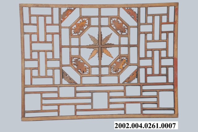 本件為漢和洋風八腳紅眠床之頂棚,構造上可以分為前後兩部分,前半部又可分為中左右三個區塊,因面對紅眠床入口裝飾較多,故中間區塊為鏤空龜紋構造,並在中央八角形區塊為木片堆疊的菊花浮雕,外側六角形內則有花草紋浮雕,四邊角落則有蝙蝠雕刻。左樣兩區塊則相對簡單,為連續交錯的亞字形構造。後半部因位於紅眠床內側,且下方架設有眠床櫃,故同樣為簡潔的連續交錯的亞字形構造。