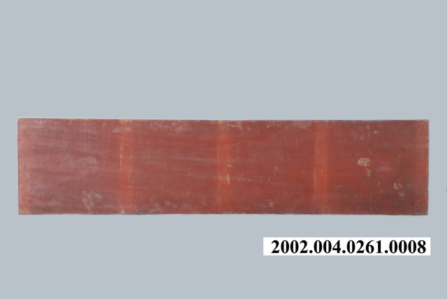 本藏品為漢和洋風八腳紅眠床的3塊床板之一,長183.9公分,寬43.2公分,高2公分,為單體木製,通體塗上朱漆,沒有施加其他裝飾,底部可見與底座支架接合的痕跡。本件紅眠床共以3塊床板組成,沒有出現榫卯的接合構造,每塊間長寬尺寸略有差異。
