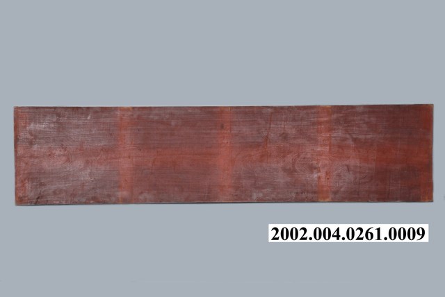 本藏品為漢和洋風八腳紅眠床的3塊床板之一,長183.6公分,寬43.4公分,高1.8公分,為單體木製,通體塗上朱漆,沒有施加其他裝飾,底部可見與底座支架接合的痕跡。本件紅眠床共以3塊床板組成,沒有出現榫卯的接合構造,每塊間長寬尺寸略有差異。