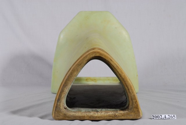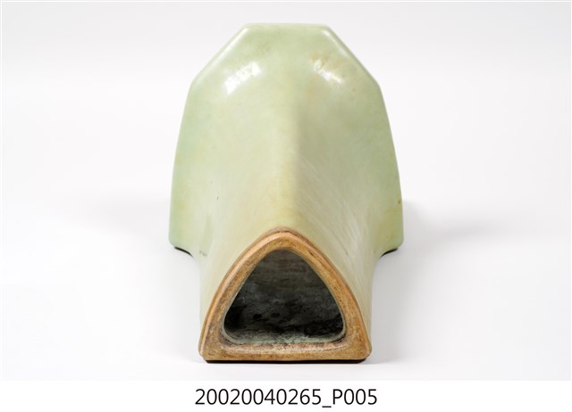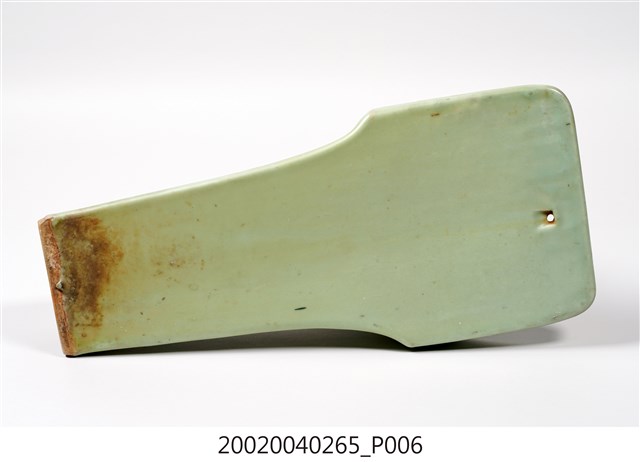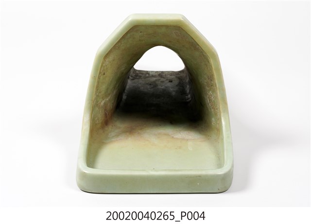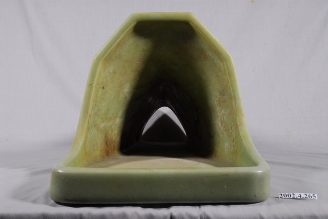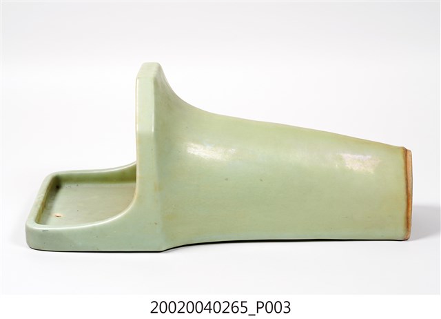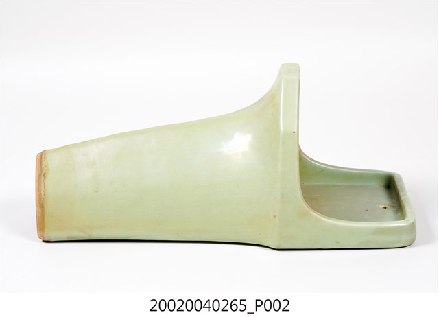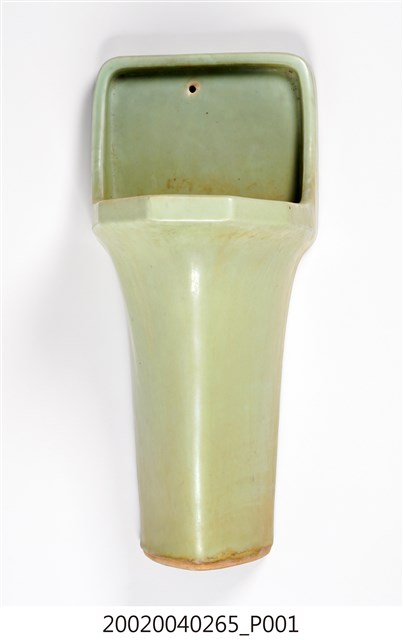 1.此男用壁掛式尿斗,器長28.5公分,寬26.6公分,高64公分,青瓷燒製。器身呈直立式漏斗狀,上寬下窄,開口向上屬朝顏形。器身為淡青色釉,上半背部立面、器腹內及器底未上釉,腰部至腹部以下寬度漸窄,多有侵蝕髒汙痕跡。壺口外緣呈半六角形。器身下半部外側多有褪色痕跡。2.朝顏形尿斗屬壁掛式便壺,男用居多,亦有少數女用器形。尿斗需配合完善的穢物管線設施,屬於現代公共衛生系統發展後產生之器物。過去多為公共場合使用。