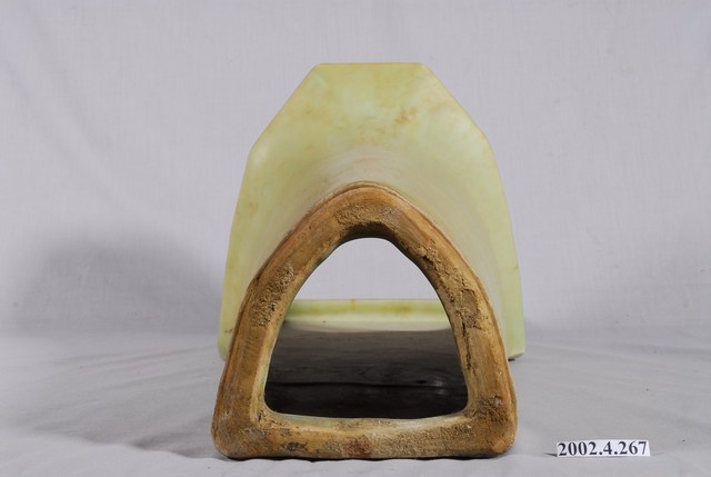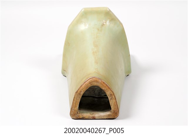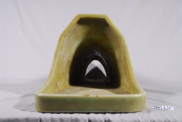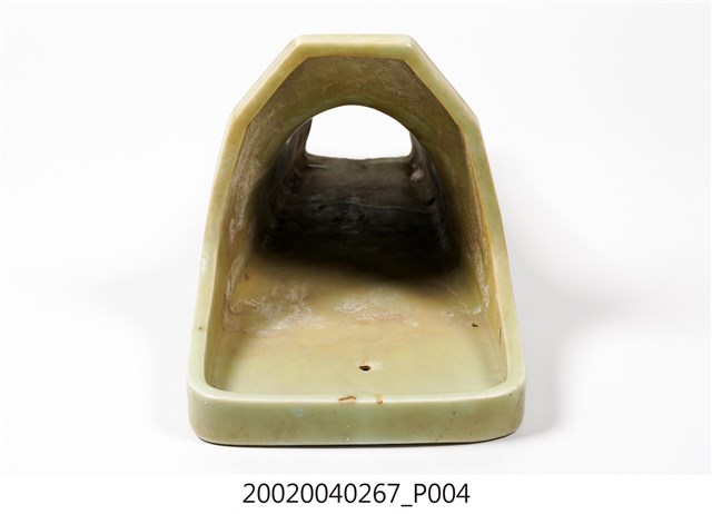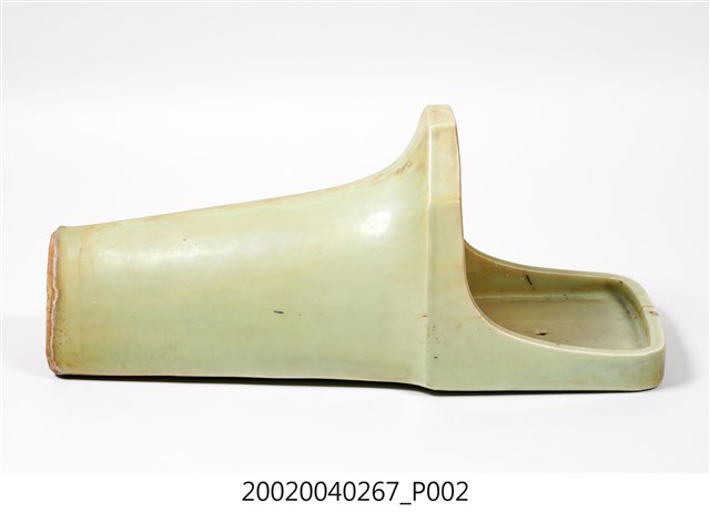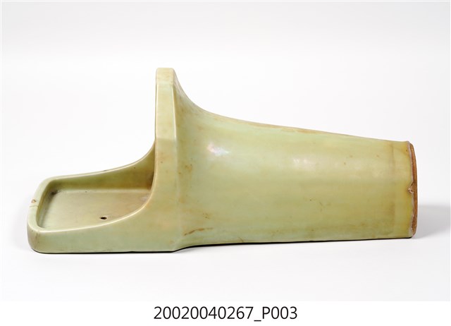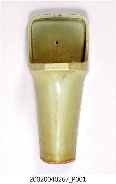1.此男用壁掛式尿斗,器長25.9公分,寬25.3公分,高63.3公分,瓷土燒製。器身呈直立式漏斗狀,上寬下窄,開口向上屬朝顏形。器身上淡青色釉,上半背部立面、器腹內及器底未上釉,腰部至腹部以下寬度漸窄,多有侵蝕髒汙痕跡。壺口外緣呈半六角形。器身下半部外側多有褪色痕跡。2.朝顏形尿斗屬壁掛式便壺,男用居多,亦有少數女用器形。尿斗需配合完善的穢物管線設施,屬於現代公共衛生系統發展後產生之器物。過去多為公共場合使用。