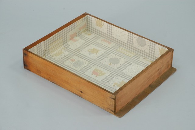 本藏品為乾漆素面菱格窗菜櫥的3個抽屜中的1個,長36.5公分、寬47.2公分、高8.8公分。在前擋板中央有一金屬拉把,左右側面各可見到4個釘子眼,抽屜內部貼有現代卡通紋樣的墊子,除正面擋板施以乾漆外,其餘部位沒有油漆或裝飾。