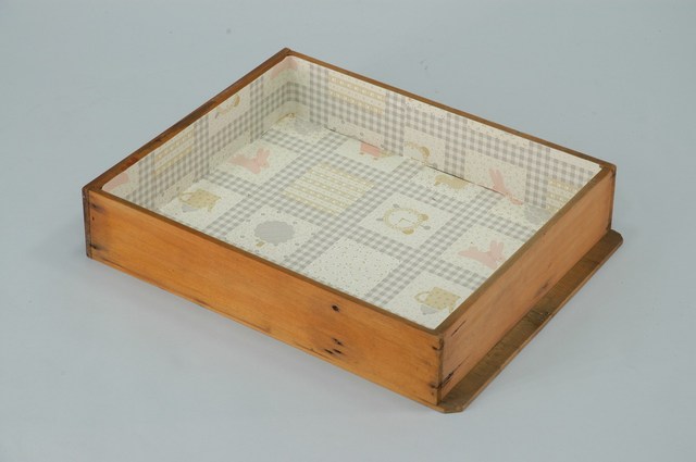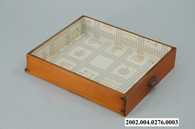 本藏品為乾漆素面菱格窗菜櫥的3個抽屜中的1個,長36.1公分、寬44.6公分、高8.9公分。在前擋板中央有一金屬拉把,左右側面各可見到4個釘子眼,抽屜內部貼有現代卡通紋樣的墊子,除正面擋板施以乾漆外,其餘部位沒有油漆或裝飾。