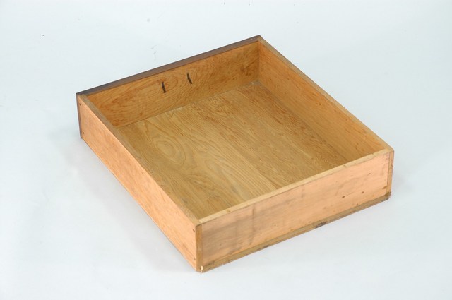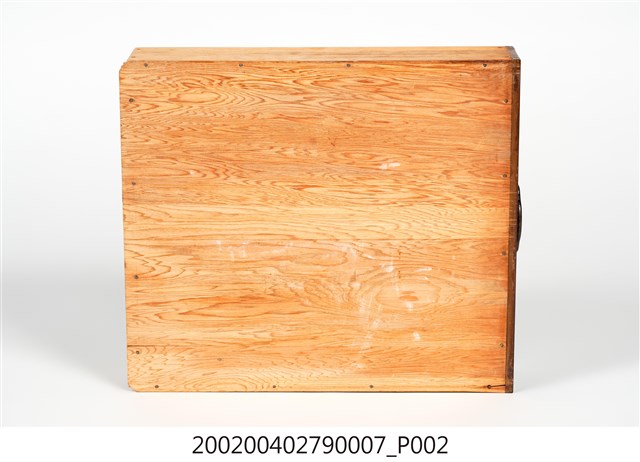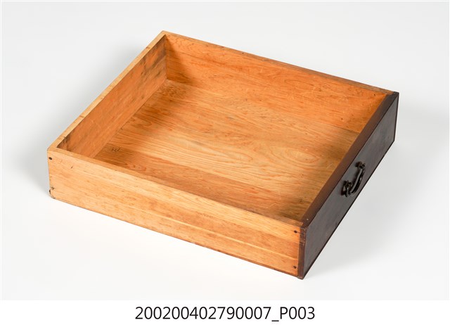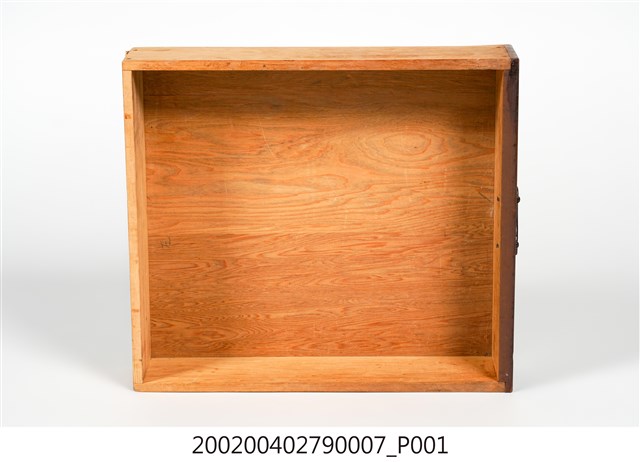 本藏品為素面幾何紋合櫥上櫥下端三個小抽屜的右側抽屜,長36.1公分、寬41.1公分、高9.2公分,在前擋板中央有金屬製雲狀拉把,方便拉出抽屜。底板為數片木板拼接而成,側面則可見到釘子眼,通體無裝飾,僅在前擋板表面施以乾漆,整體給人古樸實用的感覺。