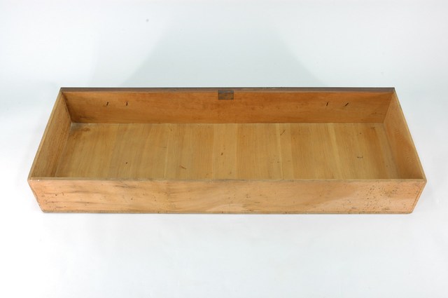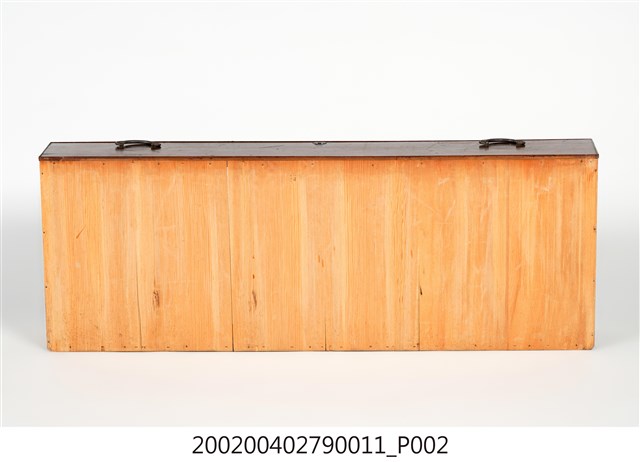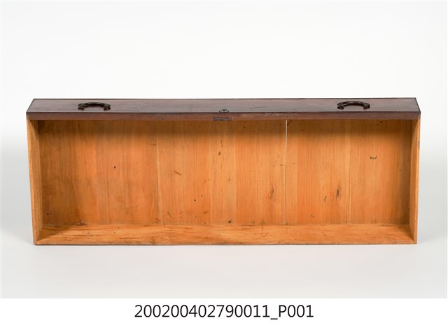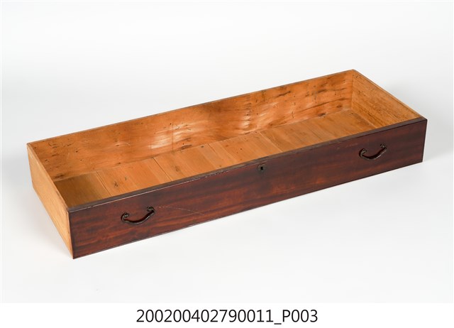 本藏品為素面幾何紋合櫥下櫃第4層的大型抽屜,長112.1公分、寬40.7公分、高14.9公分,在前擋板左右各有一個金屬製雲狀拉把,方便拉出抽屜,中央上端則有一個金屬匙孔。底板為數片木板拼接而成,通體無裝飾,僅在前擋板表面施以乾漆。