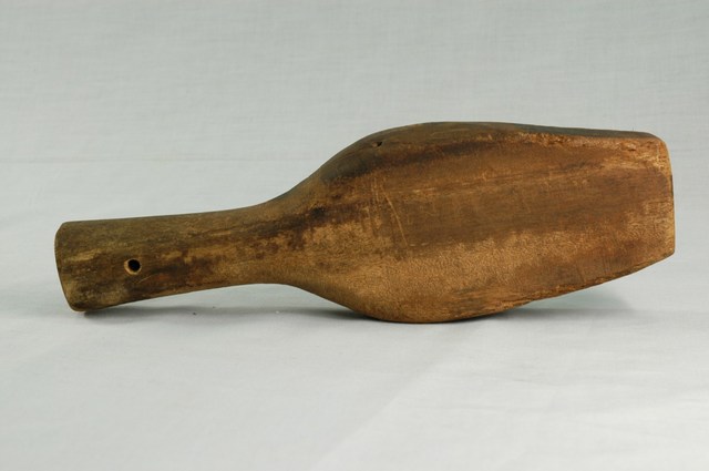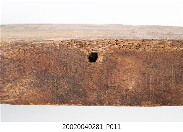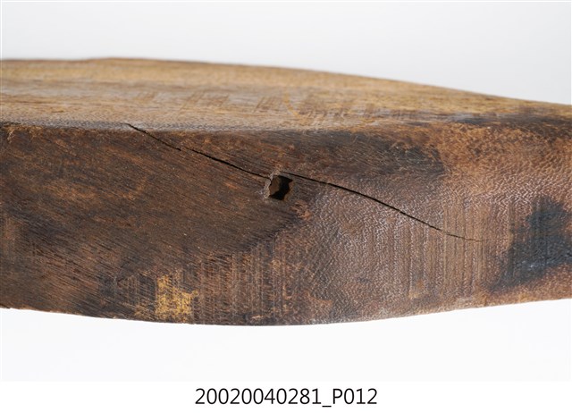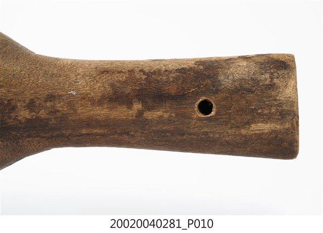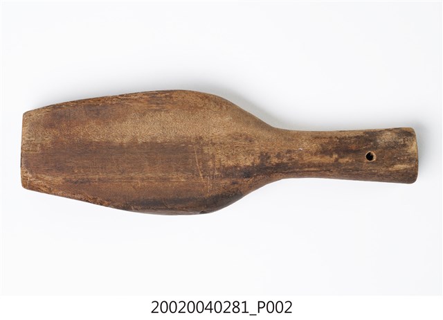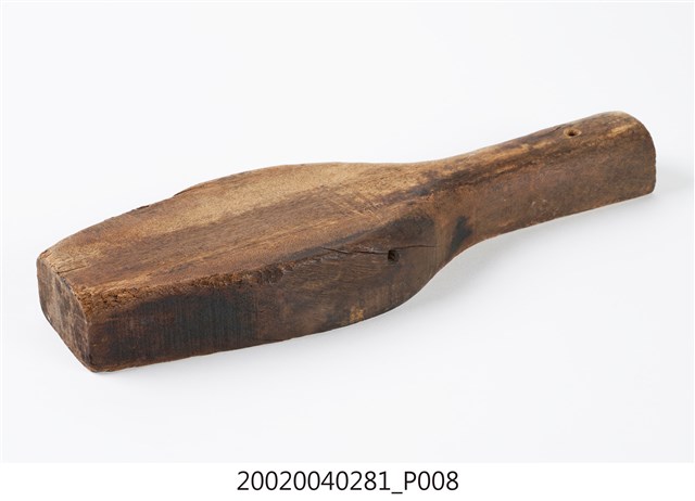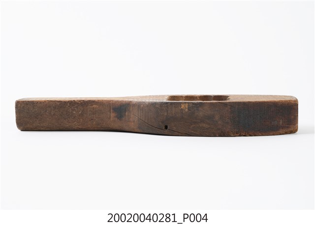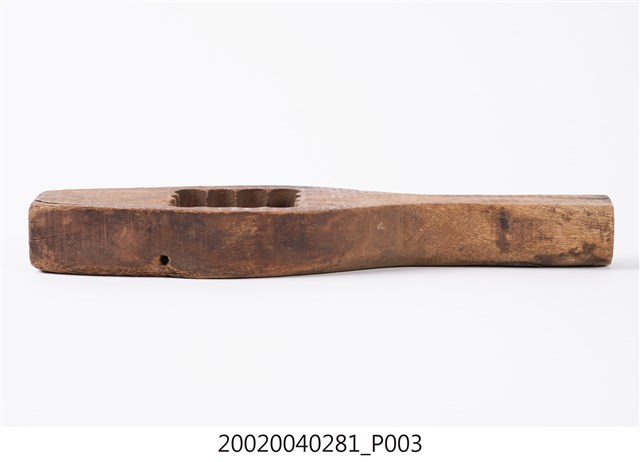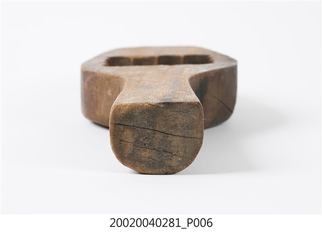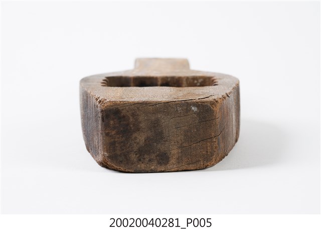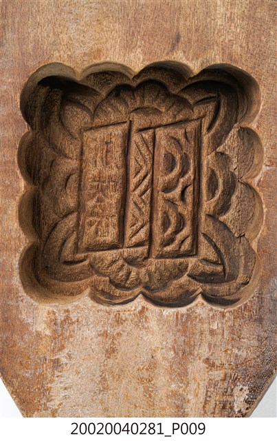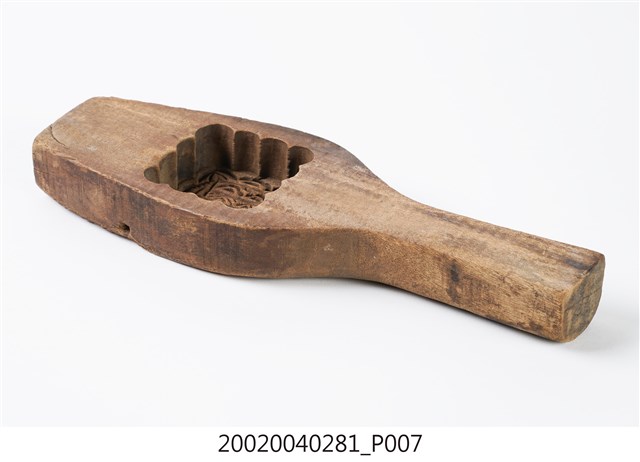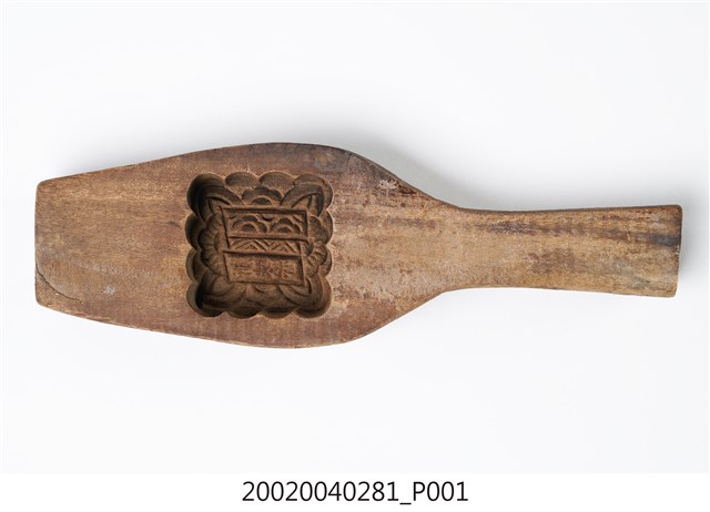 1.酒瓶形單面雕方形花草紋帶柄餅印,單面陰刻成一方形凹模,凹模外圍由十二個圓弧狀相連構成花邊,模底中央刻有「新味香」三字、波浪紋、桃花紋等三長條格構成的紋飾,周邊飾以簡易帶葉桃花紋。模內底部鑽有兩個貫穿到模具外側的小孔,為做餅時方便脫模的功能。握柄後方鑽孔,為方便穿繩吊掛之用。餅印刻模面的頂部有一裂痕,背面頂部與兩側有經久敲擊的磨損。2.印模所雕的「新味香」字樣,為製餅店家名號,故此件應屬糕餅業者製作中秋月餅之用,桃花紋飾則為臺灣民間糕餅常見之吉祥圖案。
