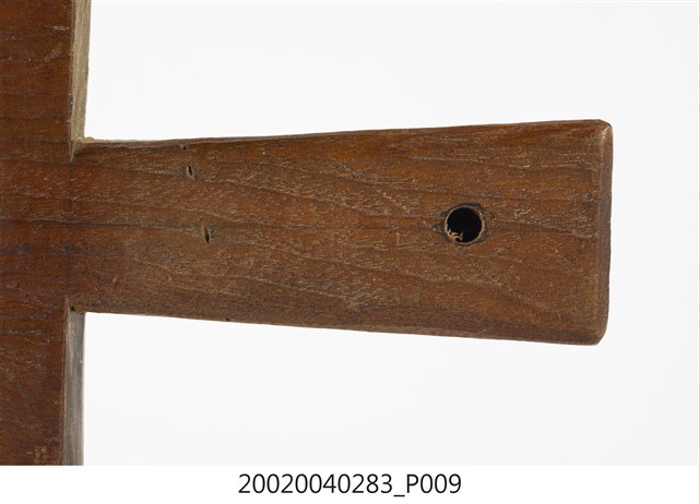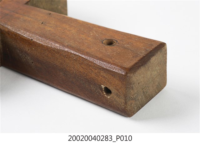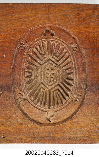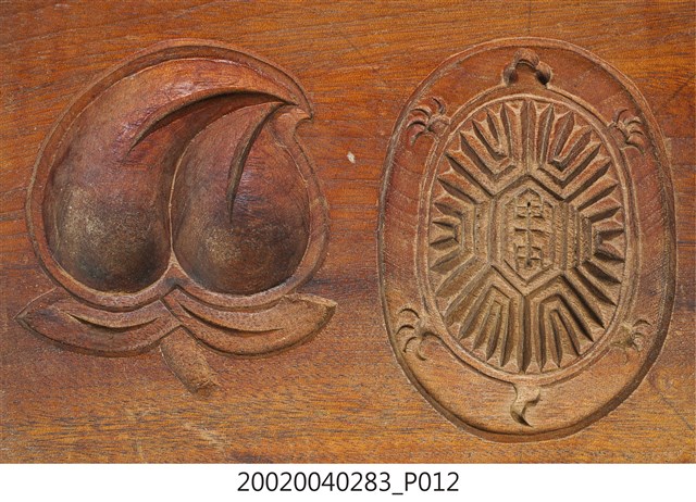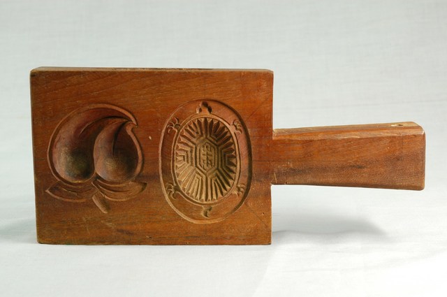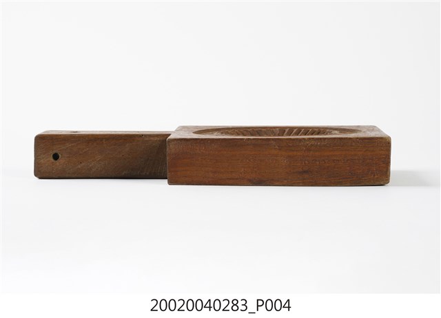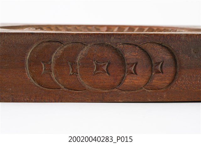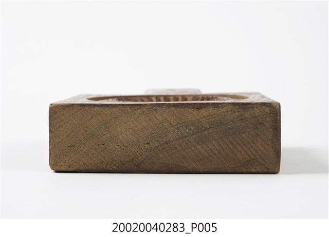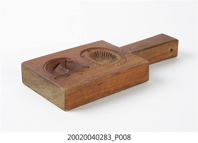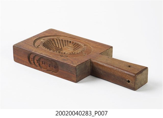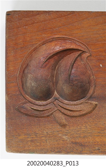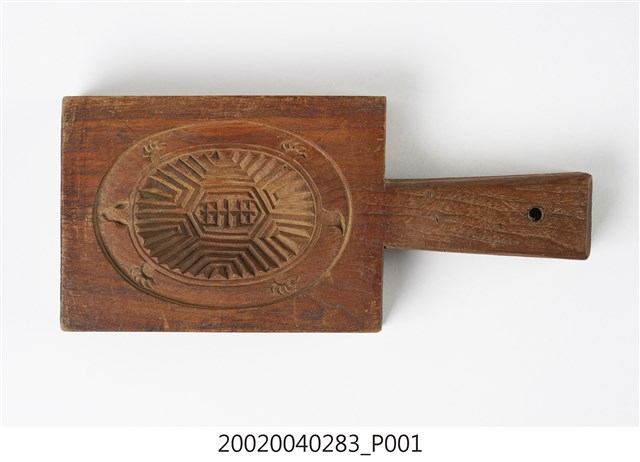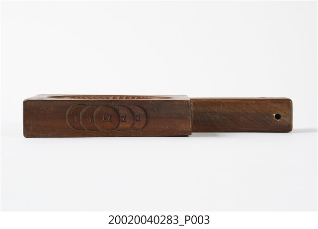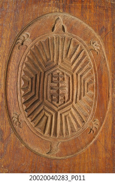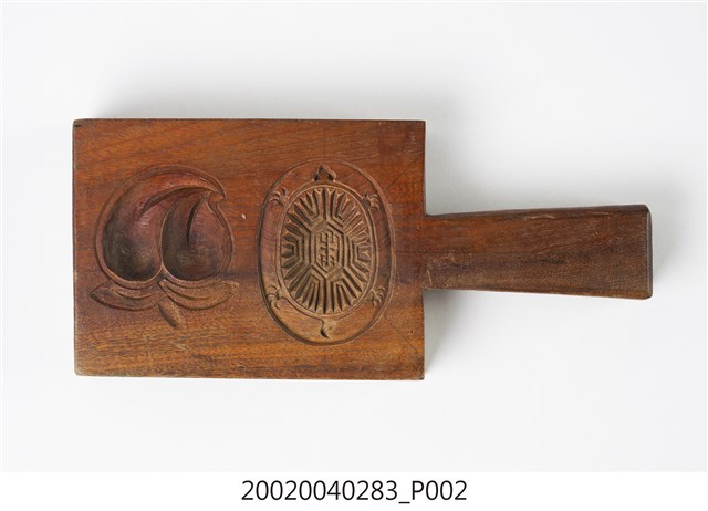 1.長方形雙面雕龜桃紋帶柄粿印,一寬面刻象徵長壽的龜、桃紋並列紋,龜形外有一橢圓框,龜身外緣刻有頭、尾、四根張爪的腳,龜甲由外至內共兩圈,內圈刻甲殼紋,中央一六角雙線框,框內為「壽」的變形字體;帶葉圓形桃的桃形由雙刻線構成,桃身有兩略深的凹陷處,可使壓出來的粿、粄有較明顯的立體感。另一寬面雕刻單隻的龜紋,龜形外有一橢圓框,龜甲共兩圈,內圈刻甲殼紋,中央一六角雙線框,框內為「壽」的變形字體。握柄方直,近尾端有一小穿孔及一個未穿透小孔,做為串繩吊掛之用。2.龜、桃紋是臺灣粿印模中常見的圖案,皆具有長壽、吉祥