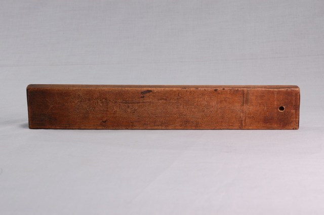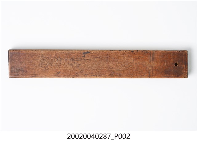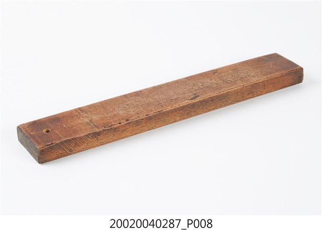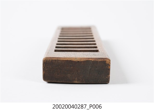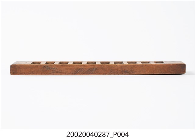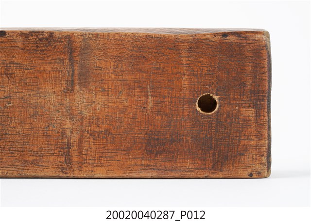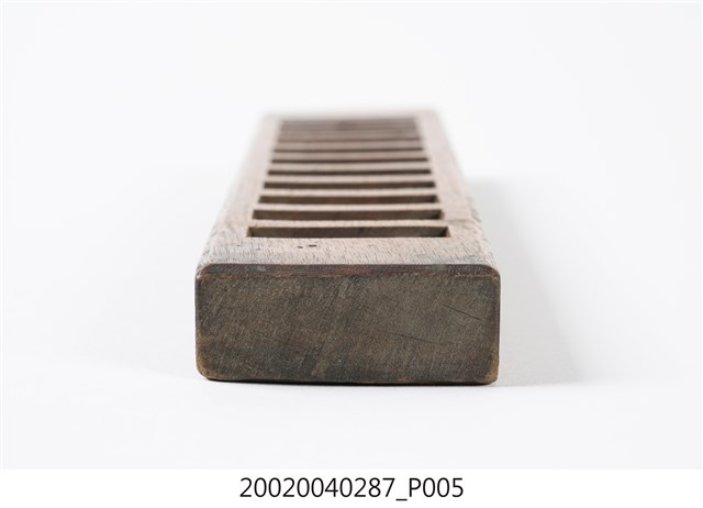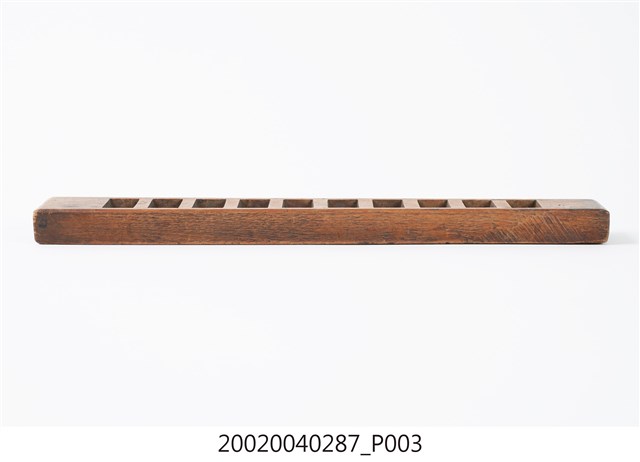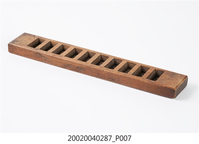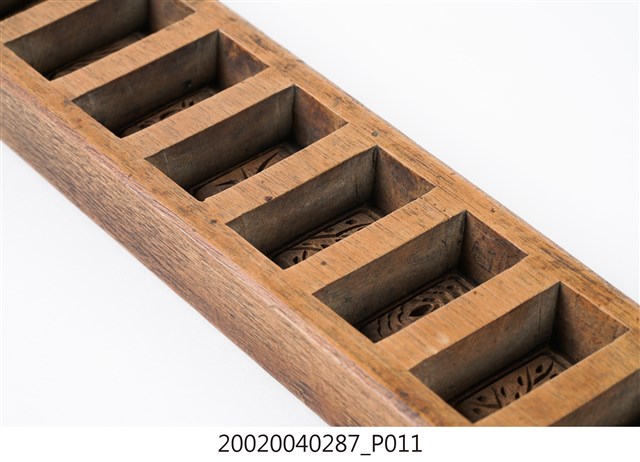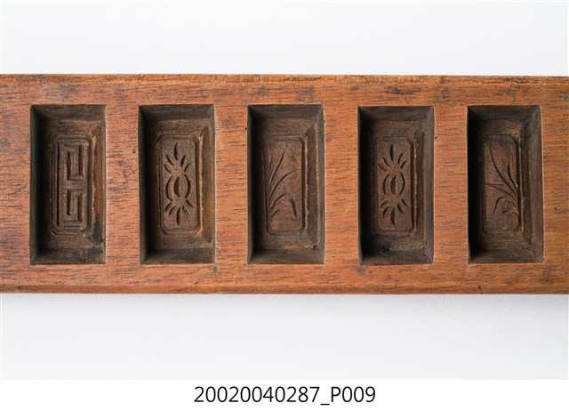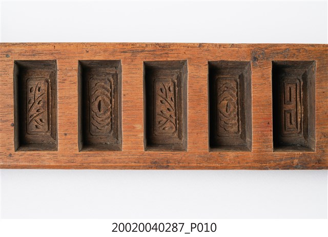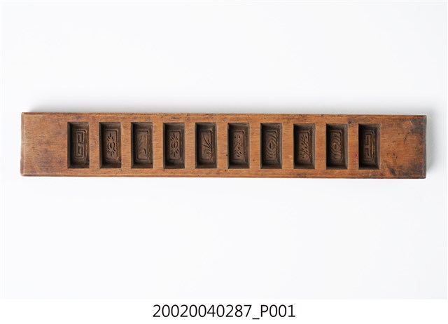 1. 長條板單面雕十枚長方錠形糕印,一次可壓印十枚長方錠糕仔,用於製作年節祭祀時象徵古代銀子的糕仔包。糕印中間突出的壓印造型結構是長方錠糕印特有的形制。印紋圖像有花朵紋、花草紋、稻穗紋、回字紋等。印模頂部平面有經久使用所造成的磨損與黑色污漬。背面鑽有一孔洞,為方便吊掛之用。2. 整體物件的紋飾都是臺灣傳統糕印模常見的紋飾,象徵興旺、豐收、吉祥等意。