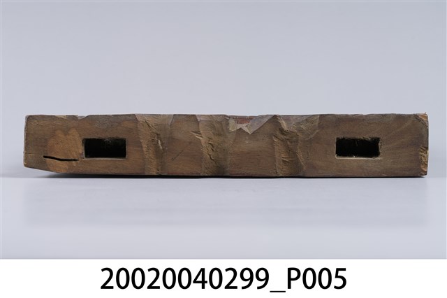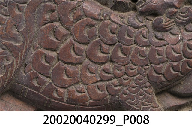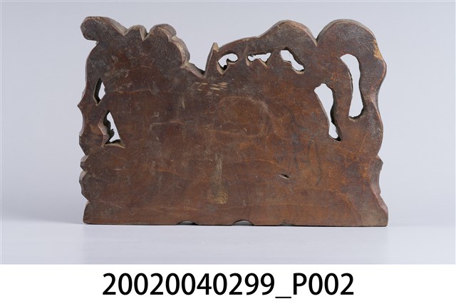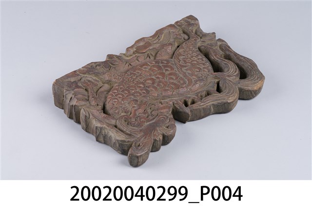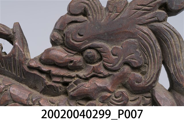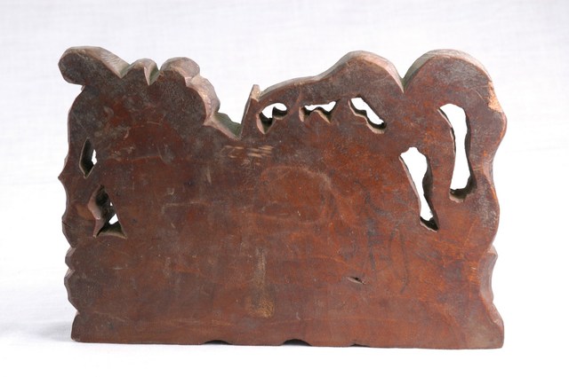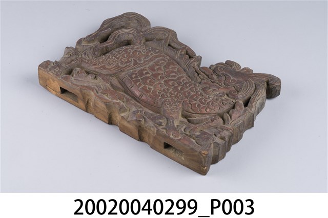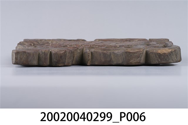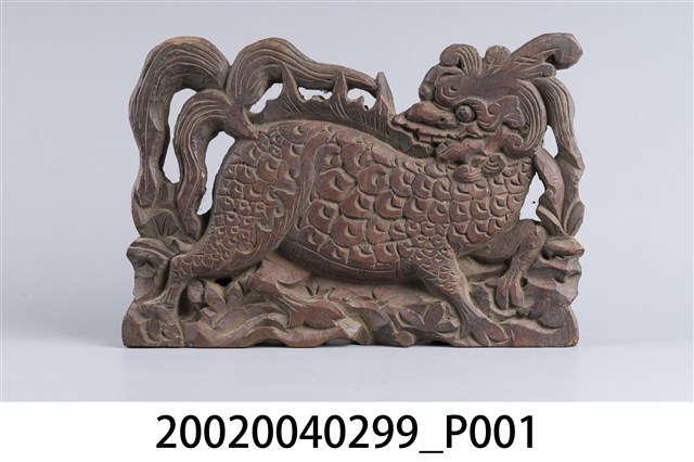 1.本件以單塊木頭刨削雕磨出一體成形的麒麟造型木質餅印。頂角高翹,凸眼咧嘴,回頭張望,身上鱗片滿布,鬃毛由頭頂至尾部立披飄散,四足張開彎曲飛奔狀,呈現出高度動態感效果,也將麒麟的氣勢表現到位。下方雕刻花草岩石,彷彿在林野中奔馳。整體木雕布局完整地形成一長方形結構,塗以棕色漆。2.該件印模主要是將其用於未壓印在餅模內的素面餅體上,壓印後進行烘烤,烤製完成的餅上即會呈現餅印的圖像。