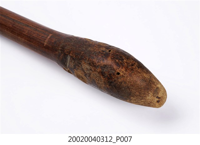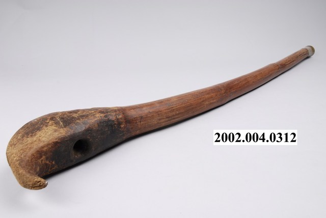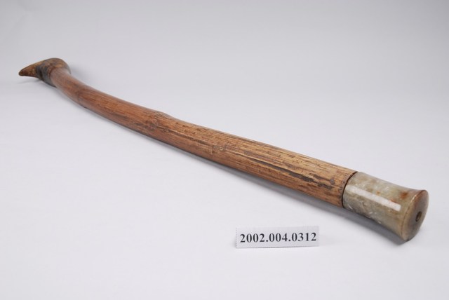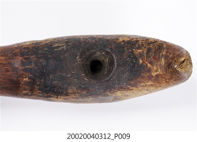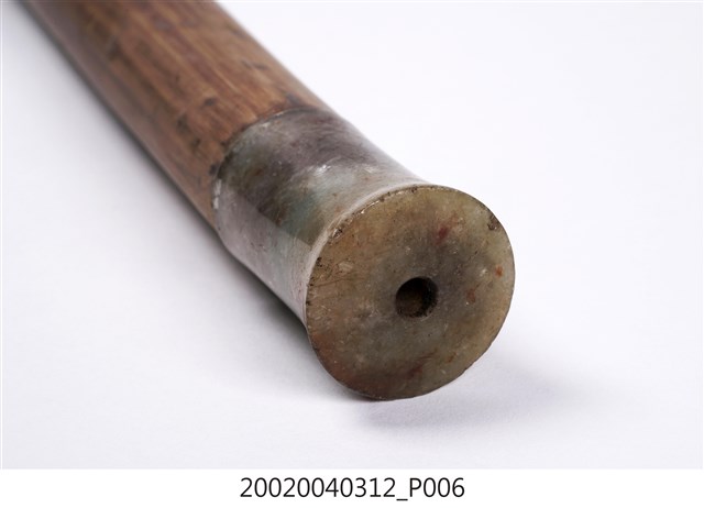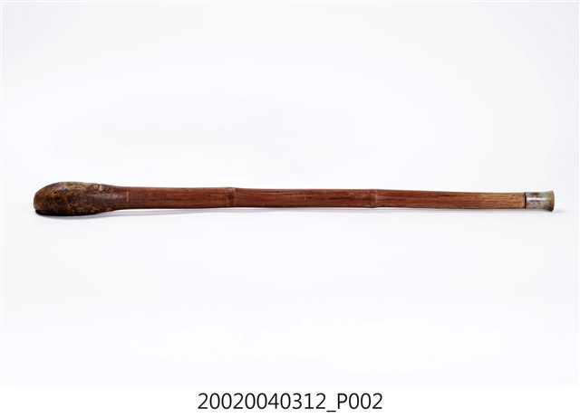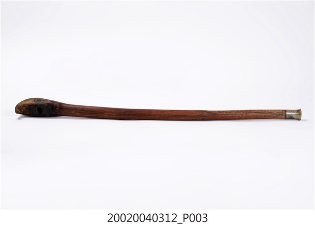 本物件為旱煙斗,煙桿為竹子製成,隱約可見幾處的竹節,經打磨過後較為光滑平順。煙鍋則延續煙桿一體形成,有燃燒過的痕跡,煙嘴材質為玉石。