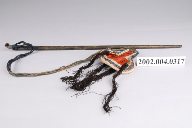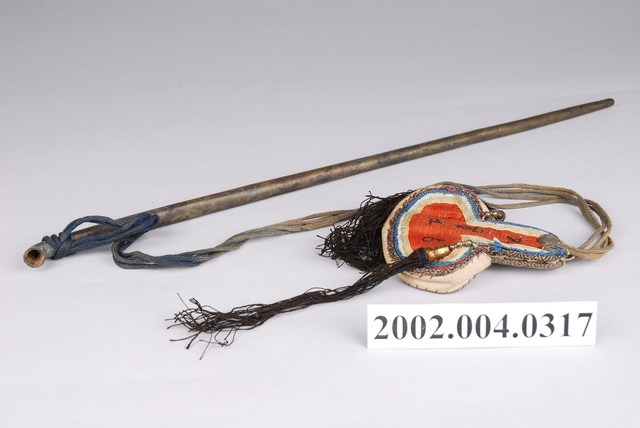 1.本組物件為旱煙斗及煙草袋,共有旱煙斗與煙草袋兩部分,煙斗全為金屬製成,外觀並無特別裝飾。煙草袋上有多種顏色的絲線,並繡有諸多圖樣與文字。