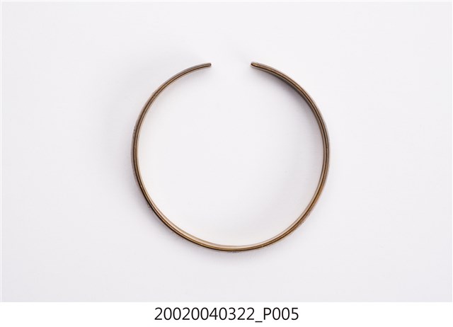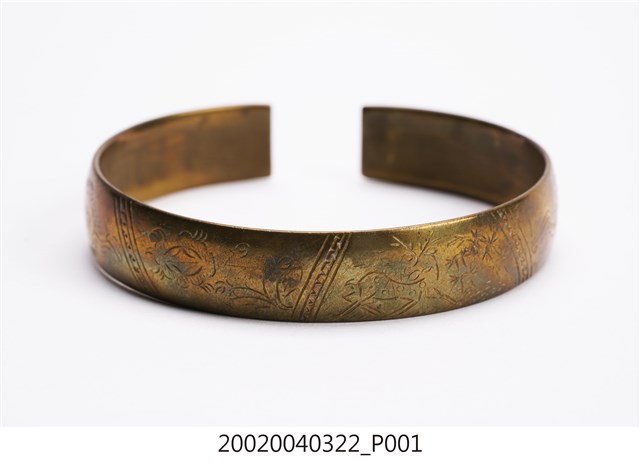 本文物為金屬手環,其有一缺口,方便使用者戴在手上。整體顏色偏黃銅色,上方刻以花、竹等紋路。臺灣原住民及漢人皆會帶配飾,而就漢人而言女性使用飾品的比率比男性高。傳統社會中女性配戴的首飾,代表家族的財富及地位,尤其在嫁娶之時,以金銀飾品作為聘禮也十分常見。在臺灣貧者在嫁娶至少要有銀簪,而富者並無限制。因此,飾品不但反映當時社會的審美觀,也是女性及其背後家族之社會地位之象徵。