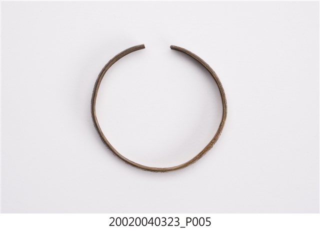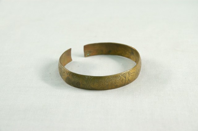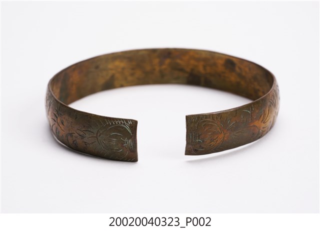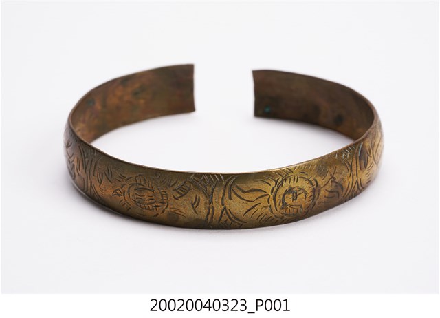 本文物為金屬手環,其有一缺口,方便使用者戴在手上。整體顏色偏黃銅色,上方刻以花、圓形等紋路。臺灣原住民及漢人皆會帶配飾,而就漢人而言女性使用飾品的比率比男性高。傳統社會中女性配戴的首飾,代表家族的財富及地位,尤其在嫁娶之時,以金銀飾品作為聘禮也十分常見。在臺灣貧者在嫁娶至少要有銀簪,而富者並無限制。因此,飾品不但反映當時社會的審美觀,也是女性及其背後家族之社會地位之象徵。