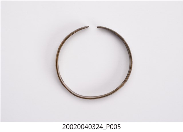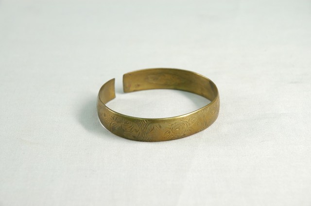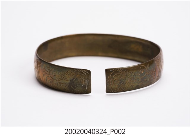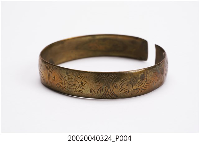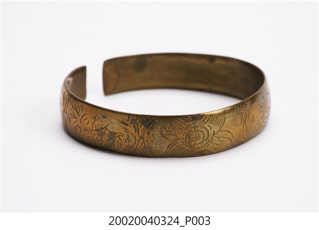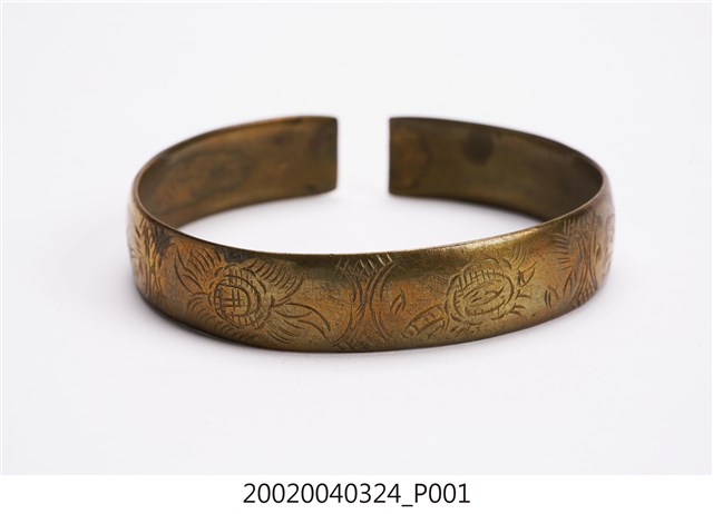 本文物為金屬手環,其有一缺口,方便使用者戴在手上。整體顏色偏黃銅色,上方刻以花、圓形等紋路。臺灣原住民及漢人皆會帶配飾,而就漢人而言女性使用飾品的比率比男性高。傳統社會中女性配戴的首飾,代表家族的財富及地位,尤其在嫁娶之時,以金銀飾品作為聘禮也十分常見。在臺灣貧者在嫁娶至少要有銀簪,而富者並無限制。因此,飾品不但反映當時社會的審美觀,也是女性及其背後家族之社會地位之象徵。