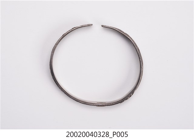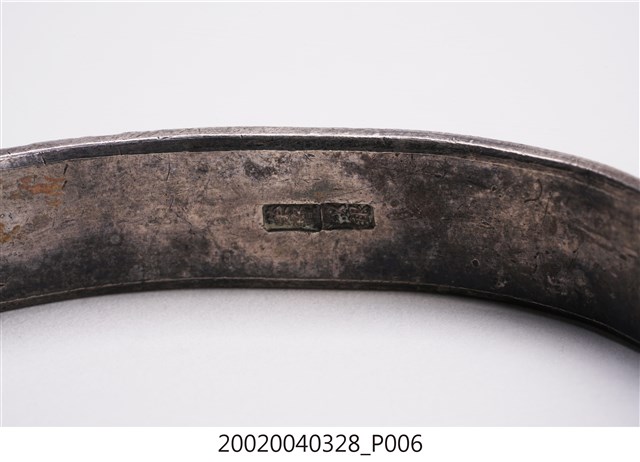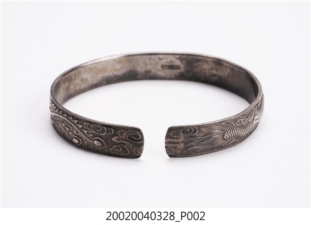 本文物為金屬手環,其有一缺口,方便使用者戴在手上。整體顏色偏銀色,上方刻以雙龍搶珠之圖騰。臺灣原住民及漢人皆會帶配飾,而就漢人而言女性使用飾品的比率比男性高。傳統社會中女性配戴的首飾,代表家族的財富及地位,尤其在嫁娶之時,以金銀飾品作為聘禮也十分常見。在臺灣貧者在嫁娶至少要有銀簪,而富者並無限制。因此,飾品不但反映當時社會的審美觀,也是女性及其背後家族之社會地位之象徵。