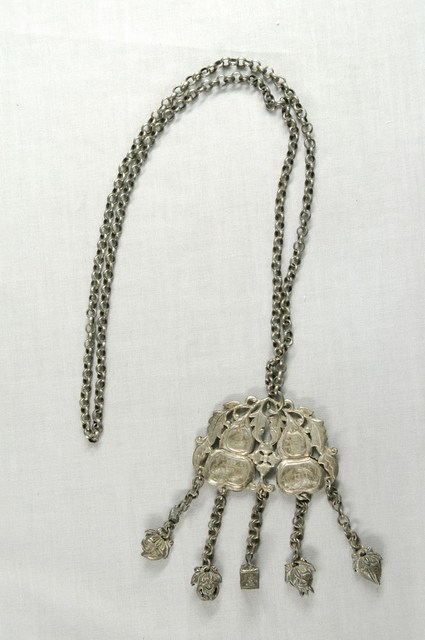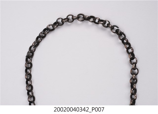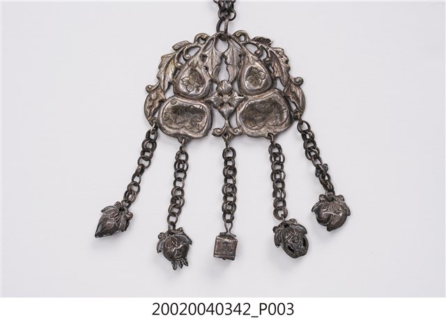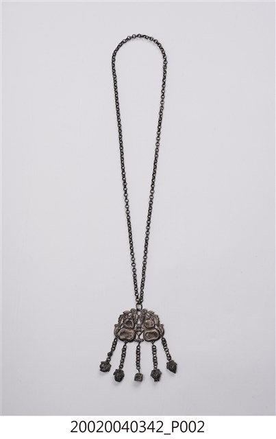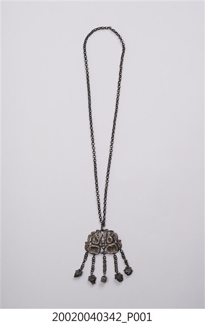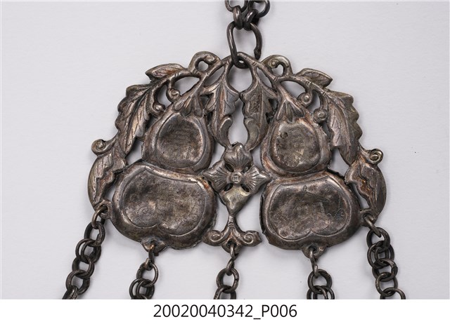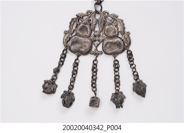 本文物為雙葫蘆長命鎖項鍊,分為項鍊墜及鍊子兩個部件。項鍊墜的部分主圖案為雙葫蘆,下方垂墜石榴、柿子、蝙蝠等五個小綴飾。鍊子部分為金屬鎖鏈狀。長命鎖為漢人給小孩配戴的飾品,主要功能為趨吉避兇。中國古代由於醫學不如現代進步,因此希望藉由長命鎖將兒童的命鎖住。上面多為五子登科、狀元及第等吉祥圖樣,也反映家庭對於嬰孩未來的期許。長命鎖材質好壞與裝飾花樣之繁複程度,皆可反映家族在社會中的地位和財富。