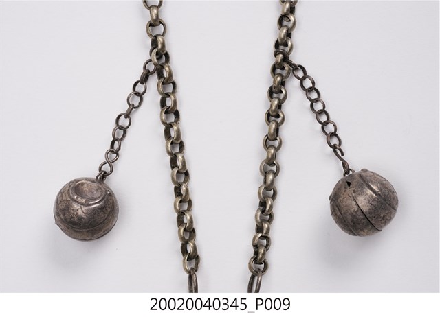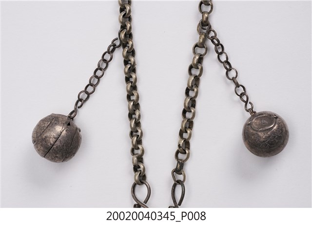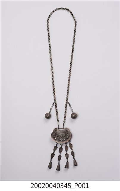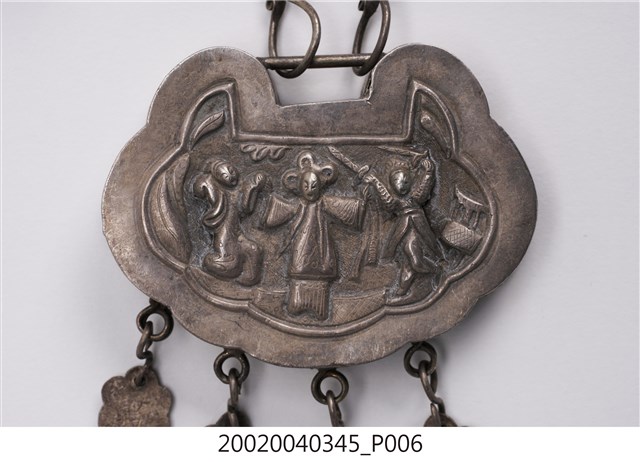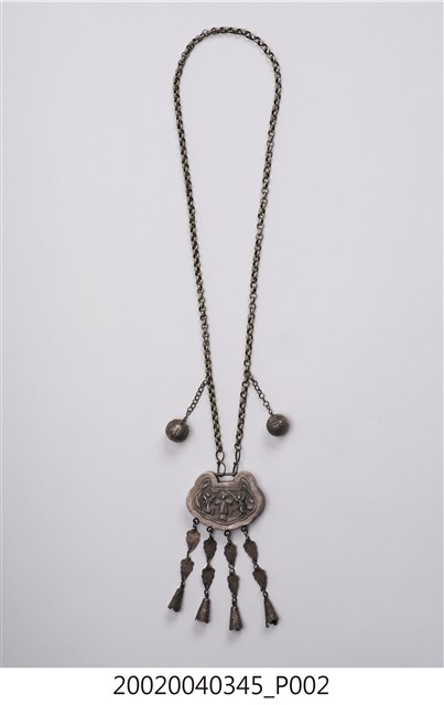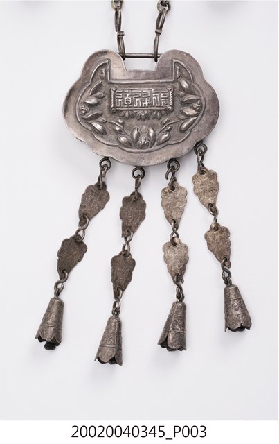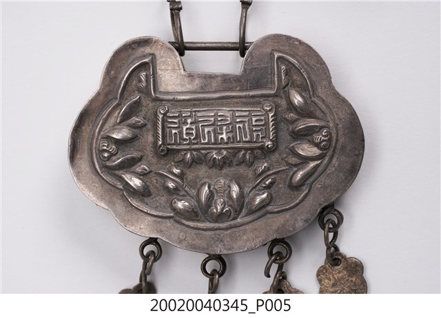 本文物為福祿壽三仙長命鎖項鍊,分為項鍊墜及鍊子兩個部件。項鍊墜的部分以雲朵為主造型,圖案則是福祿壽三仙,下方垂墜五個吊鐘狀的小綴飾,中間以雲朵造型的鐵片連接,該鐵片上面寫有:謝、吳、鄭、水等字樣。鍊子部分為金屬鎖鏈狀。長命鎖為漢人給小孩配戴的飾品,主要功能為趨吉避兇。中國古代由於醫學不如現代進步,因此希望藉由長命鎖將兒童的命鎖住。上面多為五子登科、狀元及第等吉祥圖樣,也反映家庭對於嬰孩未來的期許。長命鎖材質好壞與裝飾花樣之繁複程度,皆可反映家族在社會中的地位和財富。